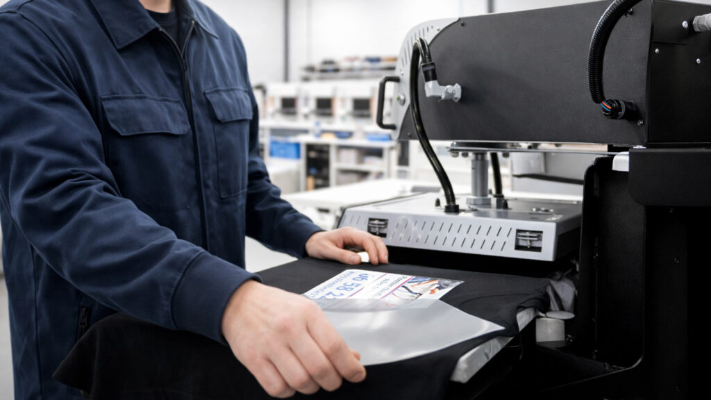 DTF(Direct To Film) er en tekstiltransferproces. Billedet trykkes først på en film og overføres derefter til tøjet eller tilbehøret ved hjælp af en varmepresse.