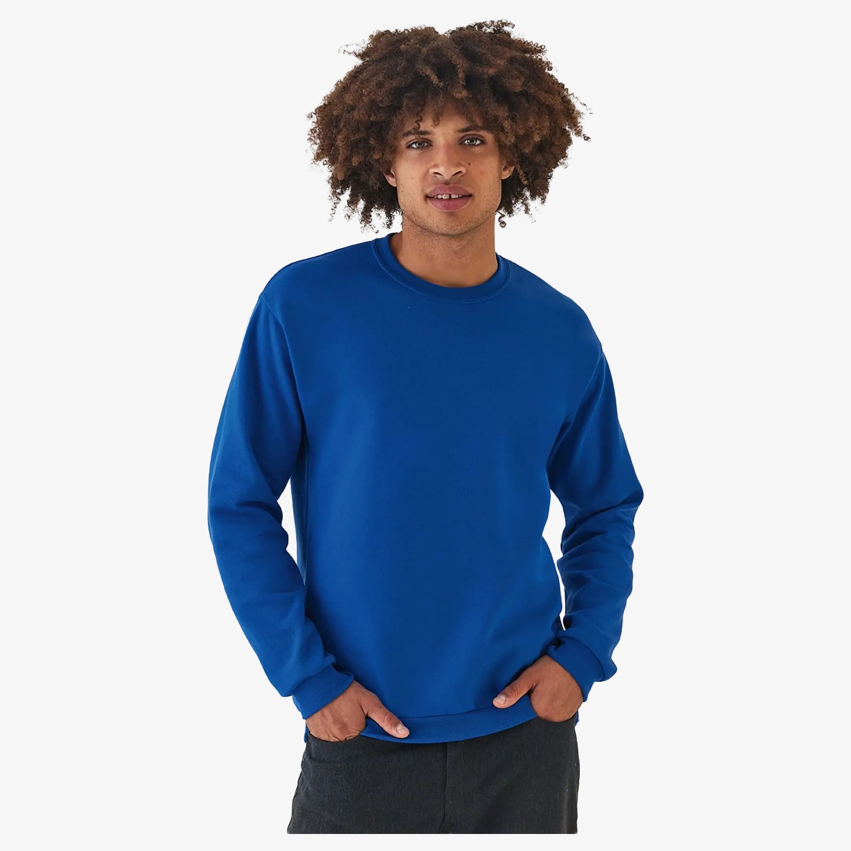 Sweat med rund krage. Retlinet skæring. Bundkant, ærm og krage i strik med elastan 1x1. Dobbeltsøm ved armhulerne og halsen. Monterede ærmer. Sidesøm. 50% bomuld/50% polyester.