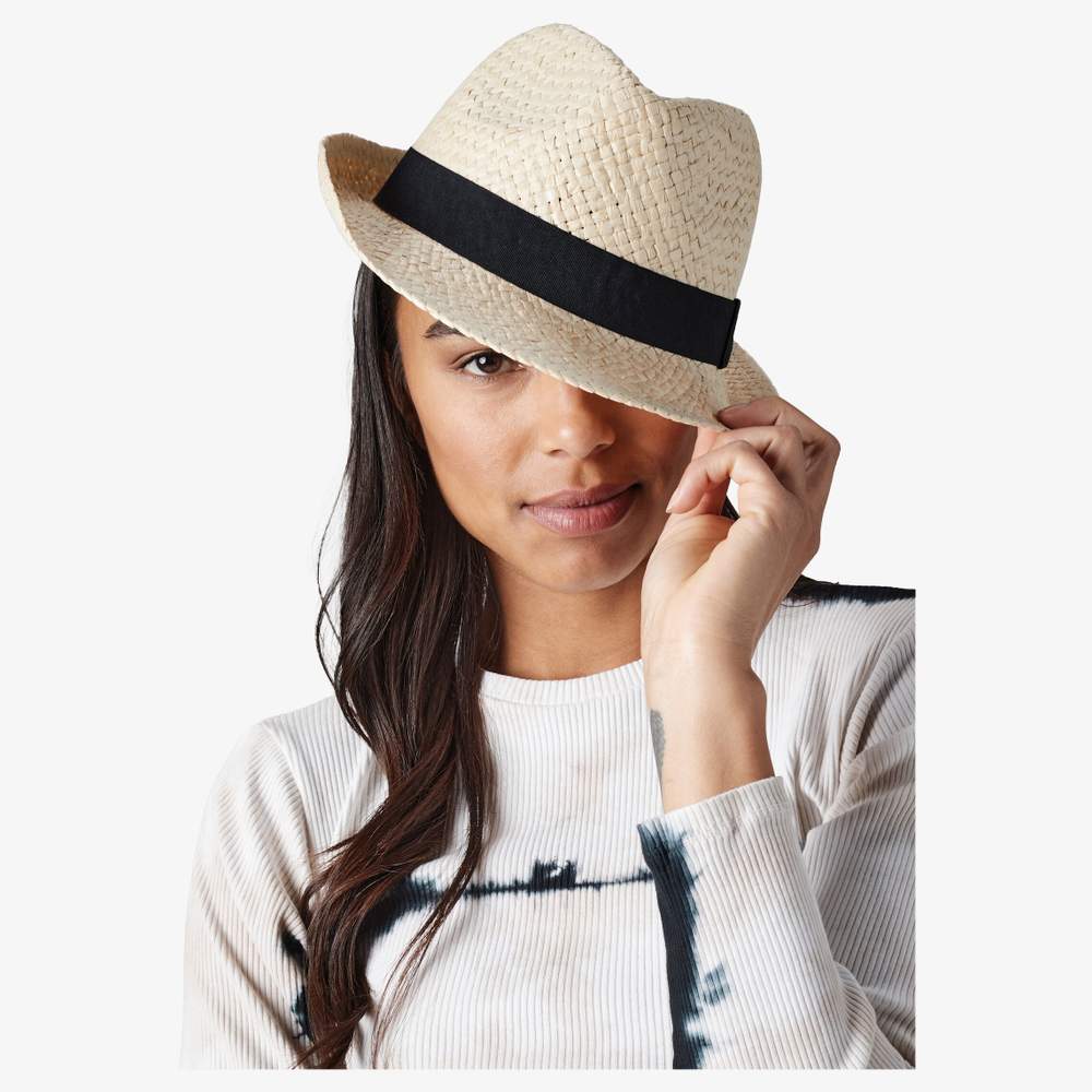 Denne trilby hat er lavet af polyesterhalm, der tilbyder en afslappet stil til forskellige lejligheder. Den har et fastsættet band, der ikke kan fjernes, og en unisex design. Det aftagelige stofetiket gør det nemt at tilpasse. Denne model er tilgængelig i størrelserne S/M og L/XL.