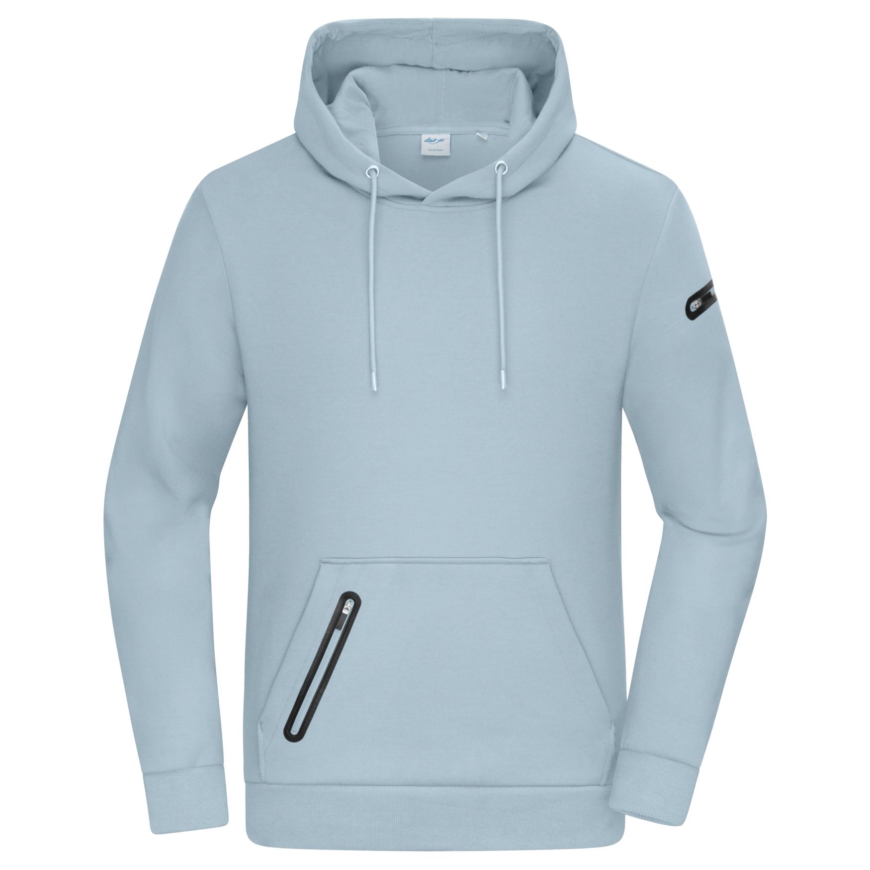 Denne sweatshirt til mænd er lavet af interlockstof, der tilbyder optimal komfort og god holdbarhed. Dens sammensætning inkluderer bomuld, genbrugt polyester og elastan, for en behagelig blanding og god holdbarhed. Det er udstyret med en kanguro-lomme med en ekstra lomme med zip, samt en lomme med zip på venstre ærme, omgivet af et trendy bånd. Denne sweatshirt tilbyder en praktisk og stilfuld løsning til daglig brug. Den kan personaliseres med broderi, hvilket gør det muligt at tilføje dit logo, et visuel eller ethvert andet grafisk element til personlig kommunikation.