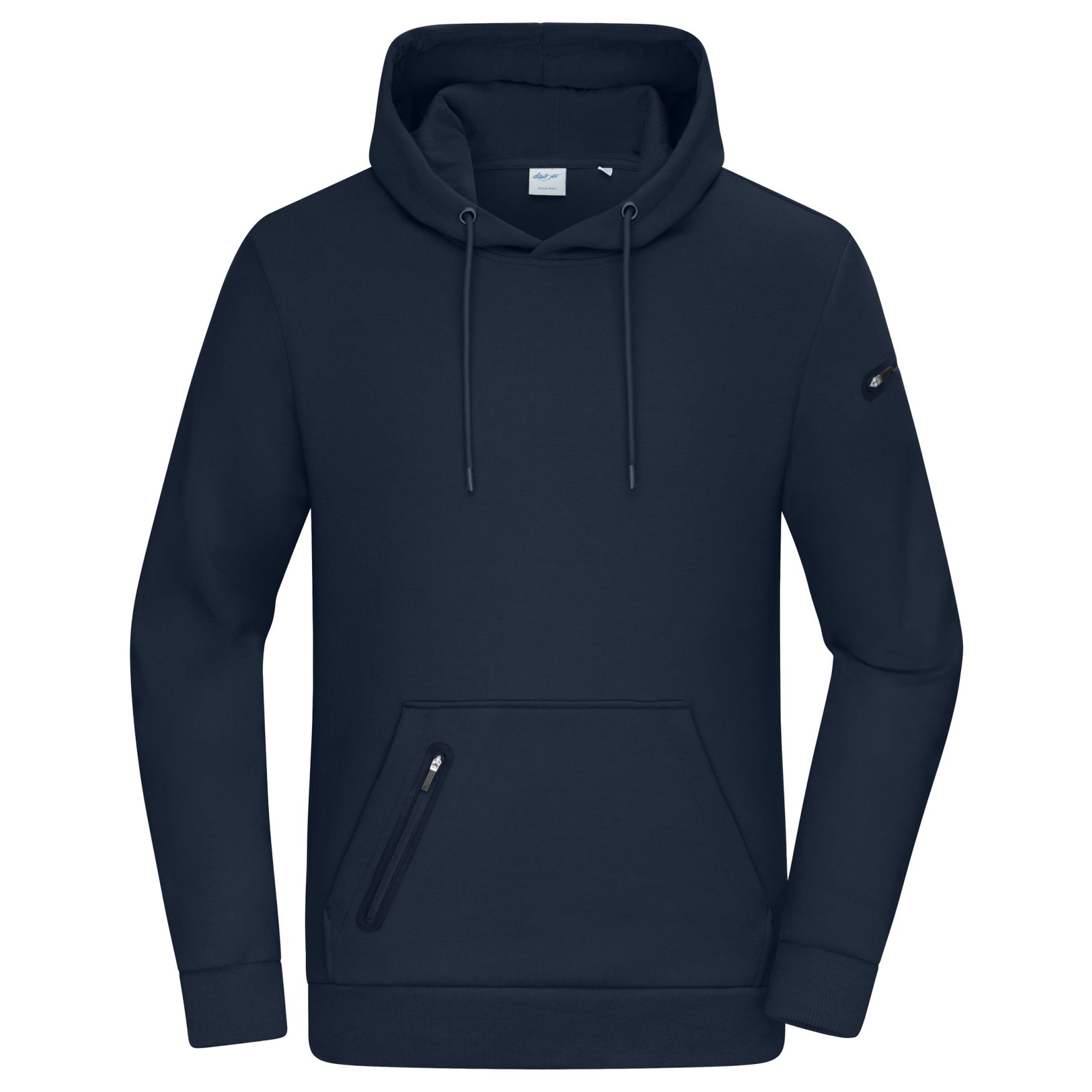 This men's hoodie is made of interlock fabric, providing increased comfort and durability. Its composition combines cotton, recycled polyester and elastane for a pleasant feel and good shape retention. It features a practical kangaroo pocket, as well as an additional zippered pocket to securely store your small items. A zippered pocket is also present on the left sleeve, edged with a decorative band. This hoodie is designed for everyday use and adapts to various activities.