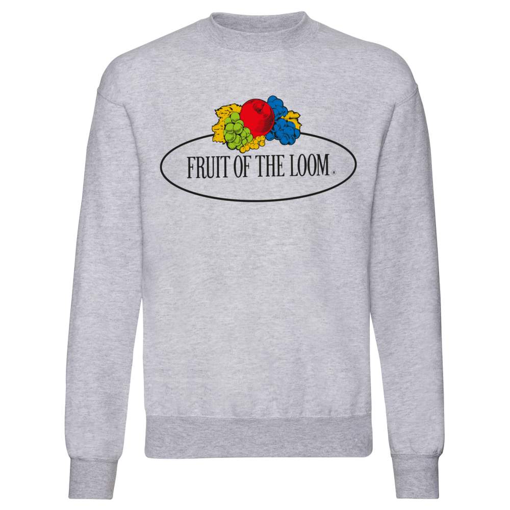 Sweat med et Fruit of the Loom logo i stor tryk på forsiden. Modellen har en rynket krave uden sømme, en renhedsstrimmel fra skulder til skulder samt rynkede kanter ved ærmene og bunden. Armhulerne og kragen er lavet med dobbelt søm. Sweatet er lavet af bomuld og polyester i tubulær konstruktion.