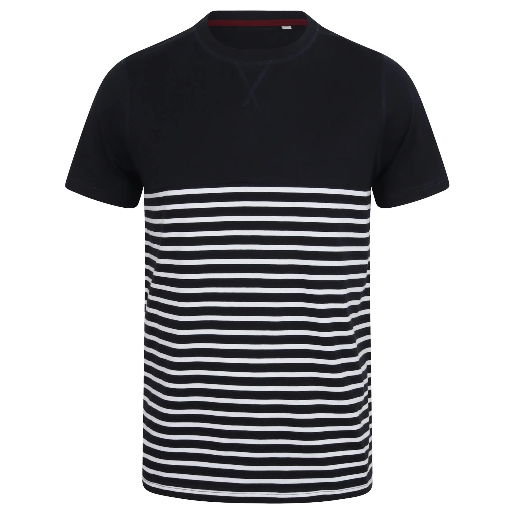 Short sleeve Breton tee-shirt er lavet af 100 % bomuld jerseystof. Den har lige snit med korte ærmer og ensfarvede detaljer på bryst og ærmer. Den nederste del er stribet, i kontrast til det ensfarvede øverste. Tee-shirten har flade sømme ved halsudskæringen, skuldrene og ærmegabene samt dobbelte stikninger ved ærmekanterne. Sømmen danner en V-form ved kraven. Tee-shirten er uden label.