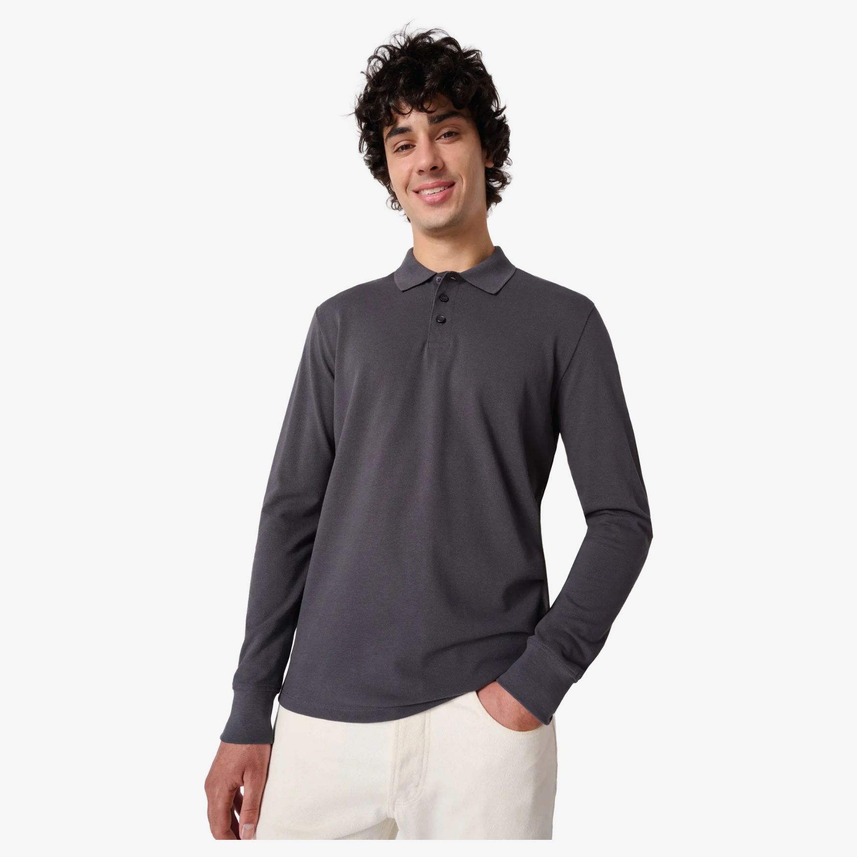 Herre langærmet polo i piqué stof med ret pasform. Lav krave med 1x1 rib afslutning, 3 tone-i-tone knapper og indvendig kravebånd i samme tone. Sideslidser og dobbelt nål i nederste kant.