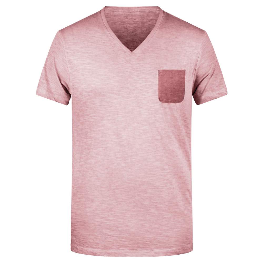 Mandstrøje med vintage udseende. Simpel jersey i flammed tråd og peget og ringtrukket biologisk bomuld. Elaboreret sprøjteprintteknik. V-hals, elastan arme, kontrastfarvet lomme på brystet 9 x 10,5 cm.