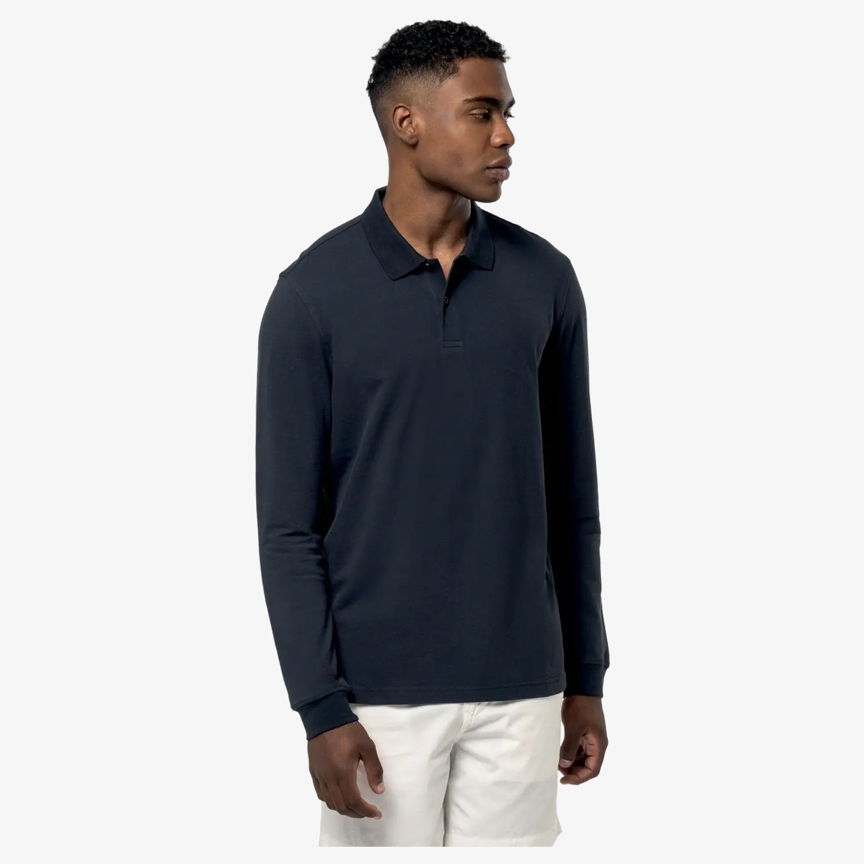 Økologisk Piqué-polo til daglig brug med piquéstrik og figursyet pasform. Krave og manchetter i 1x1 rib, stolpelukning med 2 tone-i-tone knapper, sideslidser og dobbeltsyninger.