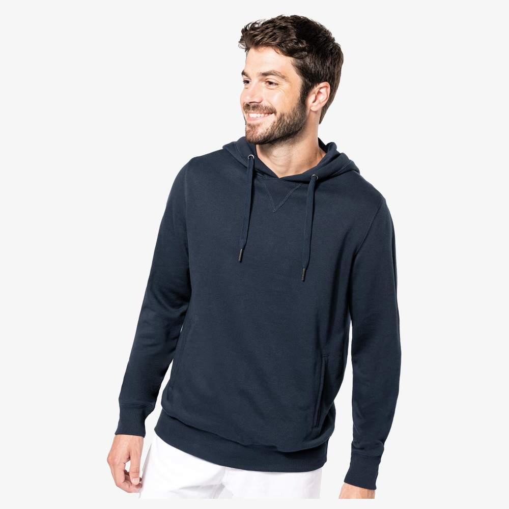 Sweat-shirt med kappe økologisk unisex. Tæt passende skæring. 2 kantstikede lommer foran. Kantstikning på ærmestykke, nederdel og kappekant. Kappe med trækstrik ton i ton med metalendestykker. Halvmåneforstærkning på bagsiden af halsen til nem tilpasning af mærket inde i tøjet. Indvendig chevronrensestrimmel på kraven og V-formet finish på halsen. Ingen mærketiket på kraven, kun en størrelseschip til nem tilpasning. Certificeret STANDARD 100 by OEKO-TEX® Nr. CQ 1007/8, IFTH. Sammensætning: 80% økologisk bomuld, 20% genbrugspolyester post-consumer (Undtagen farve Oxford Grey 75% økologisk bomuld, 25% genbrugspolyester post-consumer). Molleton ikke-børstet French Terry LST (Low Shrinkage Terry). Stof: Enzymvasket.