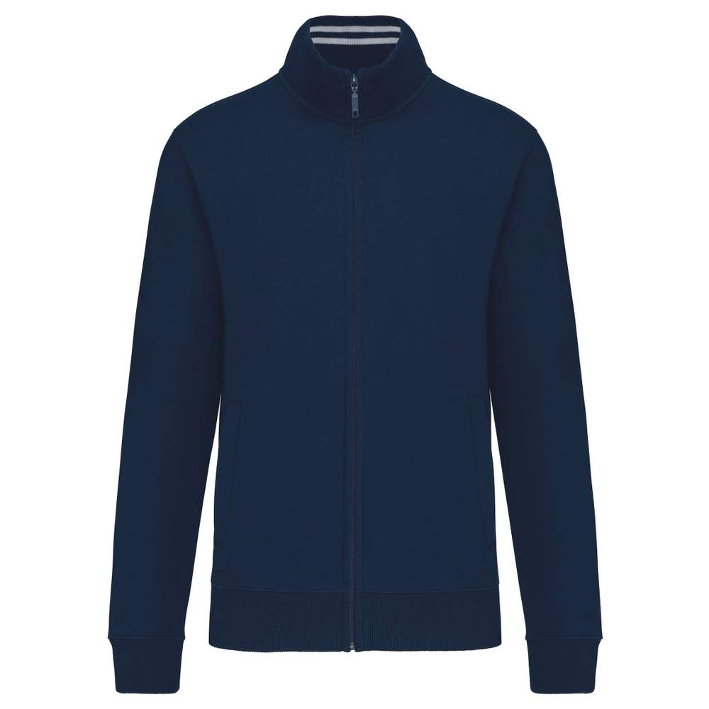 Mænds fleecet jakke med zip, fremstillet af bomuld og polyester. Den har en justeret passform opnået ved en sideindsnit i kantstøb. Indersiden af kraven er i kantstøb med kontraststriber. Den har to lommer foran og en YKK zip. Ærmernes ende og nederenden af jakken er afsluttet i kantstøb.