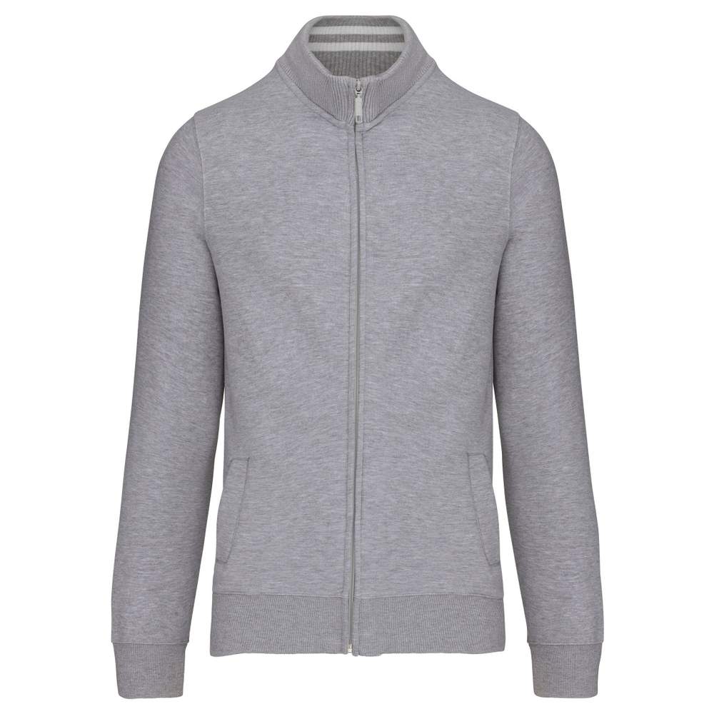 Mænds fleecet jakke med zip, fremstillet af bomuld og polyester. Den har en justeret passform opnået ved en sideindsnit i kantstøb. Indersiden af kraven er i kantstøb med kontraststriber. Den har to lommer foran og en YKK zip. Ærmernes ende og nederenden af jakken er afsluttet i kantstøb.