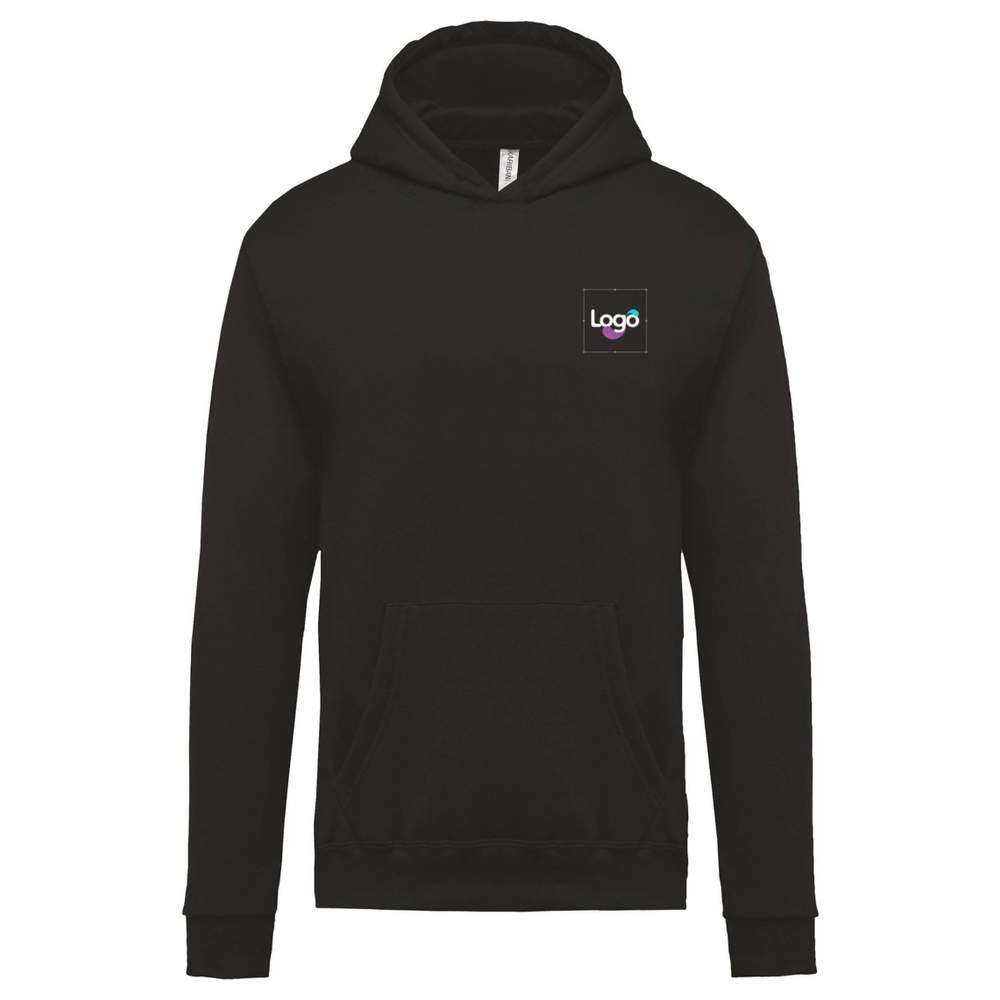 Børne sweatshirt med kappe af 80% bomuld / 20% polyester. Skraberet fleece for optimal komfort. Monterede ærmer og rørformet skæring for en klassisk pasform. Dobbelt kappe og praktiske lommer. Afslutning med kant til ærmernes og tøjets bund for bedre holdbarhed. Dette sweatshirt er ideelt til aktive børn og kan personliggøres ved brodering med dit logo eller dit billede.