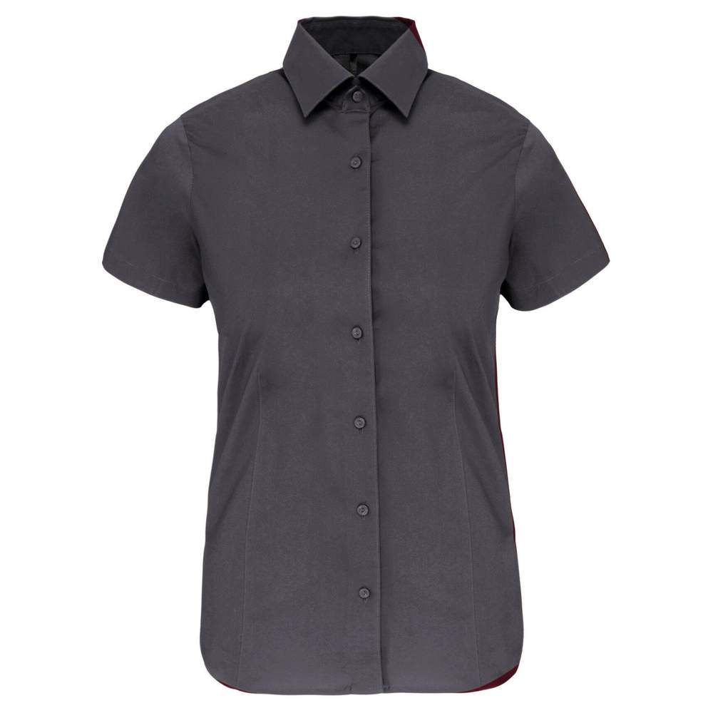 Denne kvindebluse er fremstillet af en kombination af 97% koton og 3% elastan, som tilbyder en balance mellem komfort og støtte. Dens klassiske skæring og simple krave gør den til en alsidig del, der passer til forskellige lejligheder. Indtræk i taljen, foran og bagpå bidrager til en stram figur, mens bundene af de korte ærmer er fordoblet forstærket for større holdbarhed. En mindeknap er til stede. Dens afrundede bund tilføjer en moderne touch.