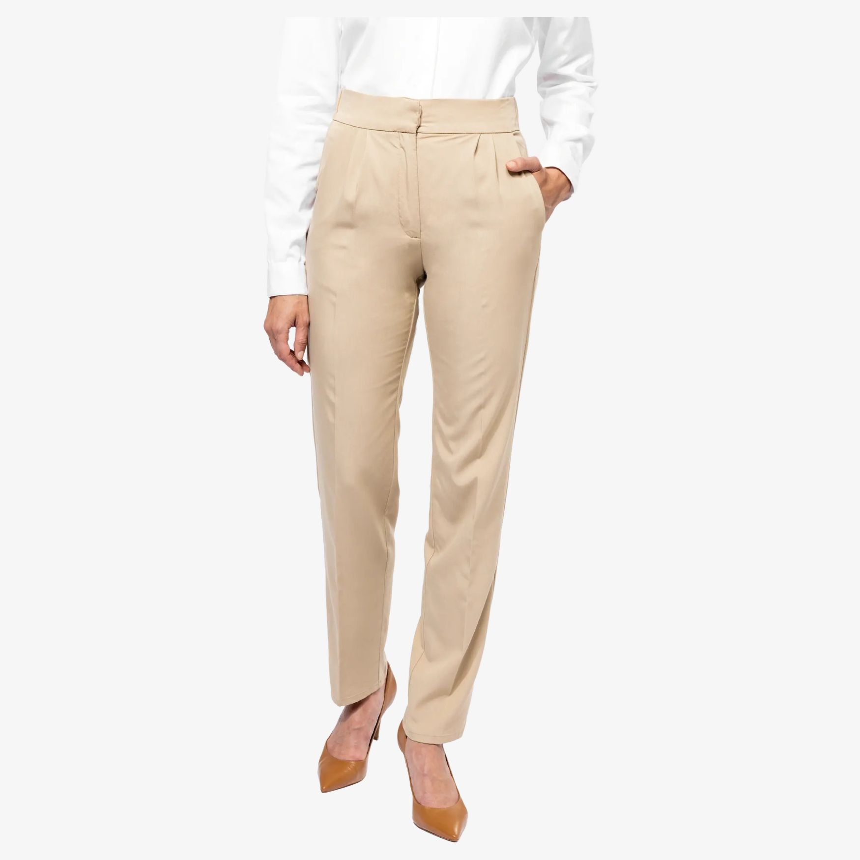 Pantalon Femme bukser pk703 i twillstof med linning med elastik bagpå og bevægelseslæg. Italienske forlommer, falske paspolerede baglommer, gylp med nylonlynlås, metalkroge og knap.