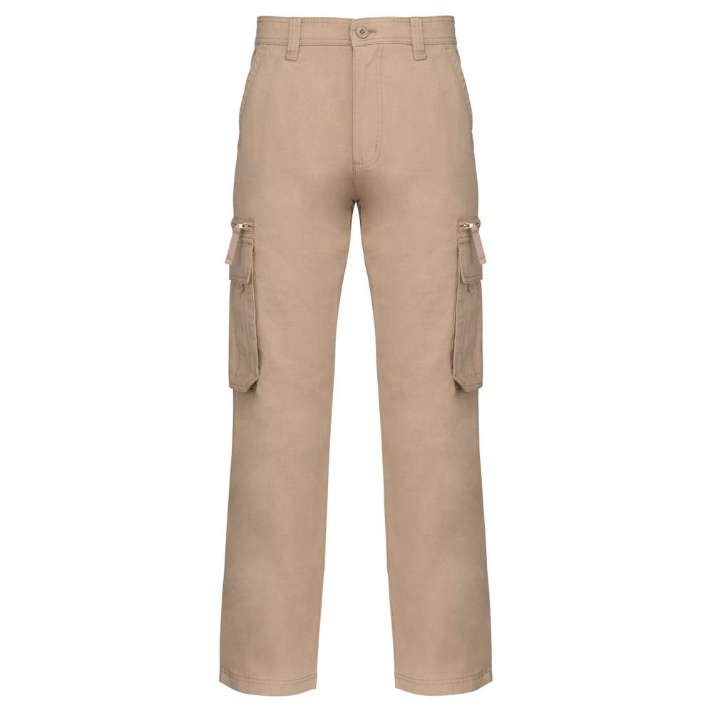 Mand multilommer lavet af 100% bomuld for optimal komfort. Dette model har en glidelås og en knap for en sikker lukning. Det tilbyder en række lommer til at imødekomme daglige behov: to klassiske siderlommer, to passepoilerede lommer med zip for at holde personlige effekter sikre, to siderlommer med fold og klap med krog og løkke til ekstra opbevaringsplads og to baglommer med klap og krog og løkke.