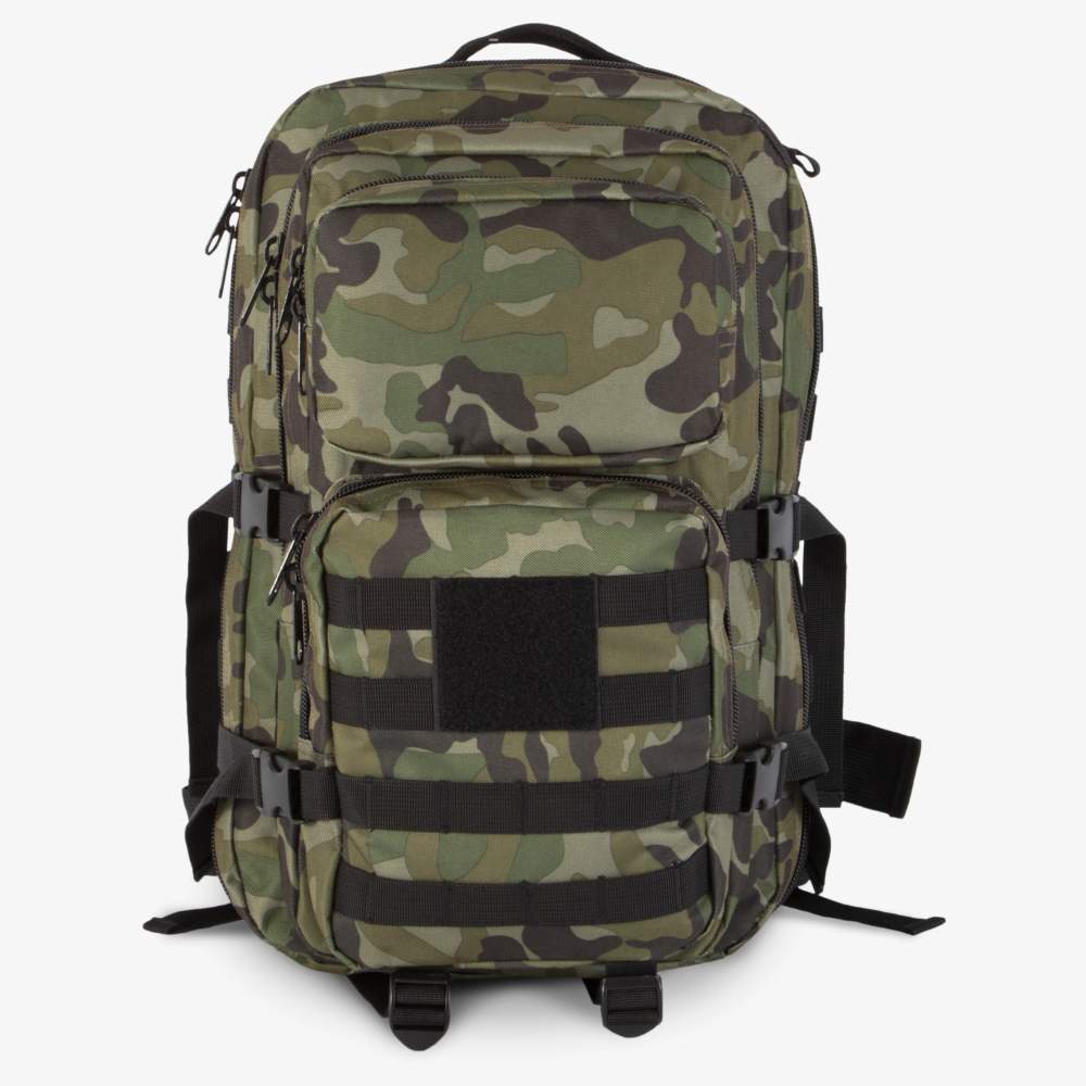 Rygsæk af polyester 600D med polyvinylbelægning, designet for øget holdbarhed. Denne rygsæk, inspireret af taktske modeller, er egnet til udendørsaktiviteter. Den omfatter en afdeling dedikeret til integration af en vandsæk med åbninger til hydrationsrør, en frontafdeling udstyret med en selvklebende strimmel til fastgørelse af dekorative patcher og kompressionsremme til at justere volumen. M.O.L.L.E. systemet gør det muligt at fastgøre forskellige tilbehør ved hjælp af karabiner eller krog. De polstrede og ergonomiske remme tilbyder optimal komfort og er justerbare for at tilpasse sig forskellige kroppstyper. Rygsækken præsenterer et kamouflage-mønster.