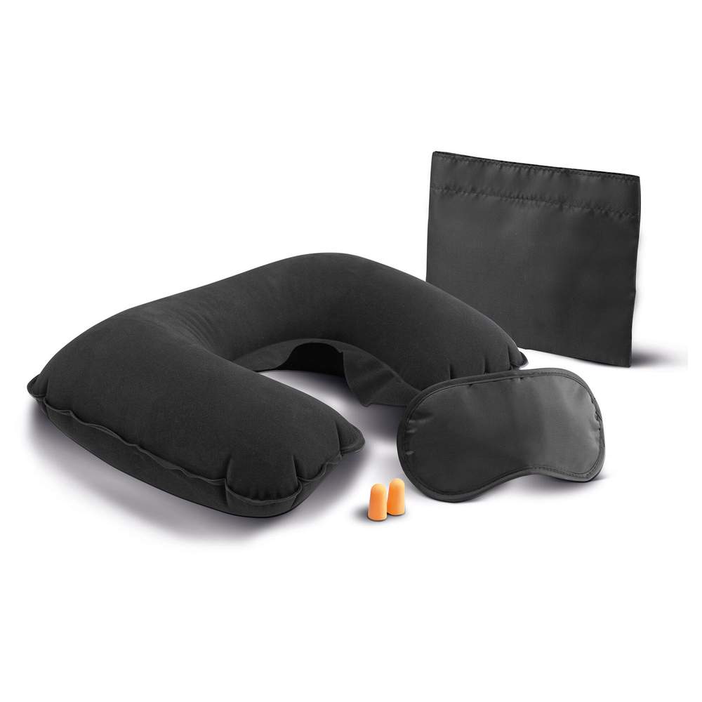 Dette rejse sæt er designet til at lette rejser. Det omfatter en rejse taske fremstillet af polyester, en personlig hus, ørepropper til optimal hvile, en øjenmaske for at blokere lys og en opblæsbar nakkestøtte for mere komfort.