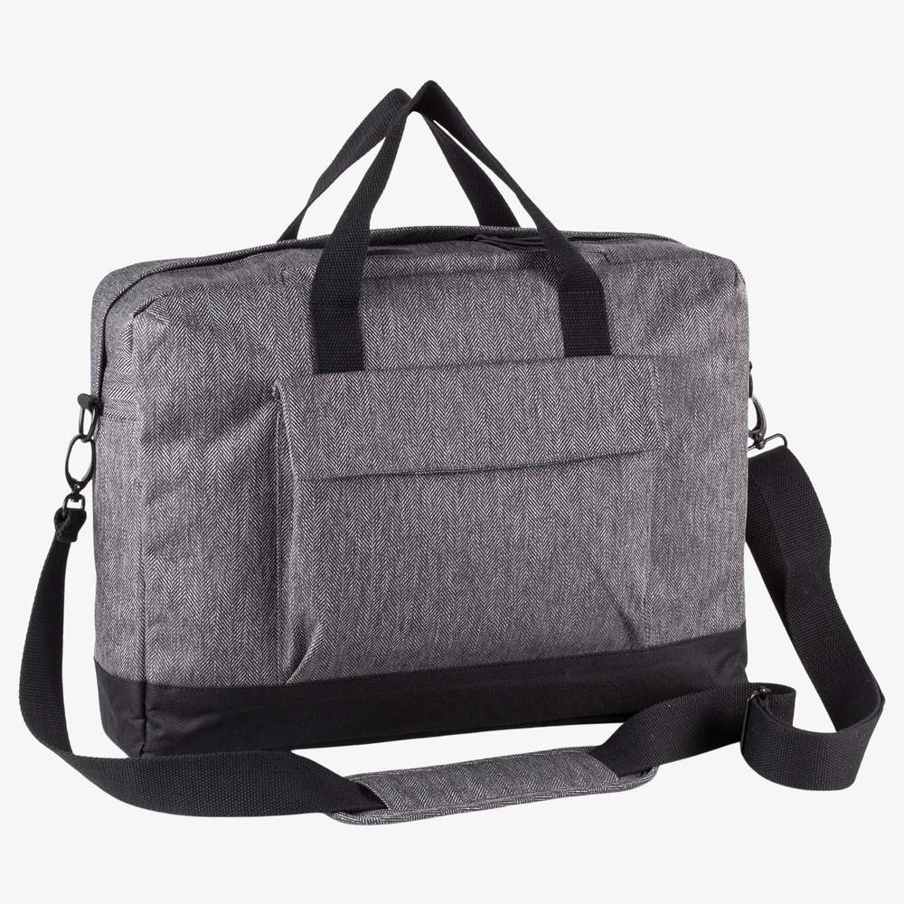 Laptop taske fremstillet af polyester, med en kontrastbund i polyester 600D. Den har en pudret afdeling til at rumme en bærbar computer op til 15 tommer, samt en pudret zip taske til en tablet. Indersiden har to taske, og en zip taske på toppen er beregnet til en mobiltelefon. Tasken er udstyret med en forreste taske med kontrast klap og knap tryk. En pasning bagpå tillader fastgørelse på en trolley, og en fjernbar skulder rem giver komfortabel transport.