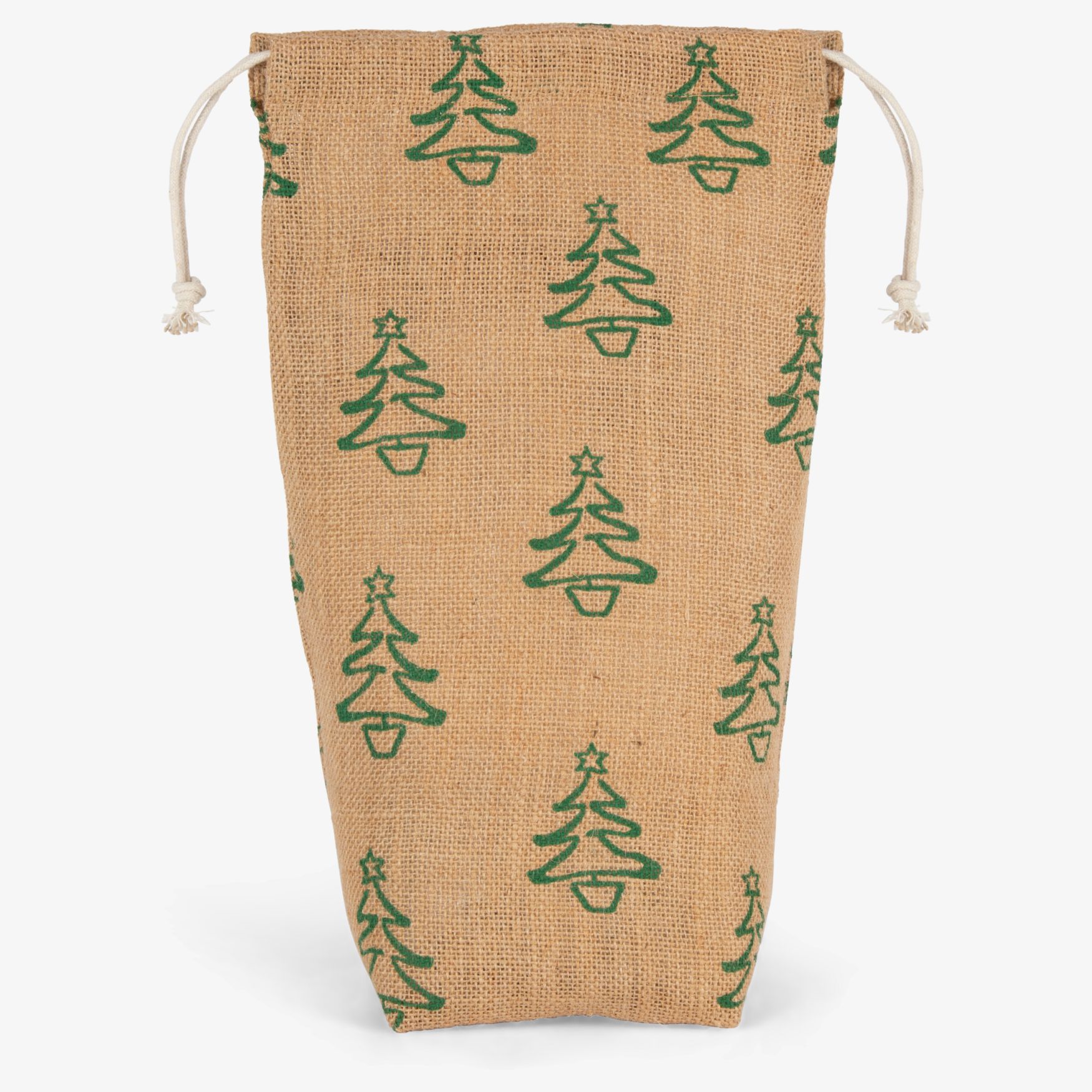 Flaskepose af jute med julmotiver. Lukkes med glidende snor. Egnet til transport af vin- eller champagneflasker. Dimensioner: 22,5 cm bredde, 11 cm dybde og 36 cm højde.