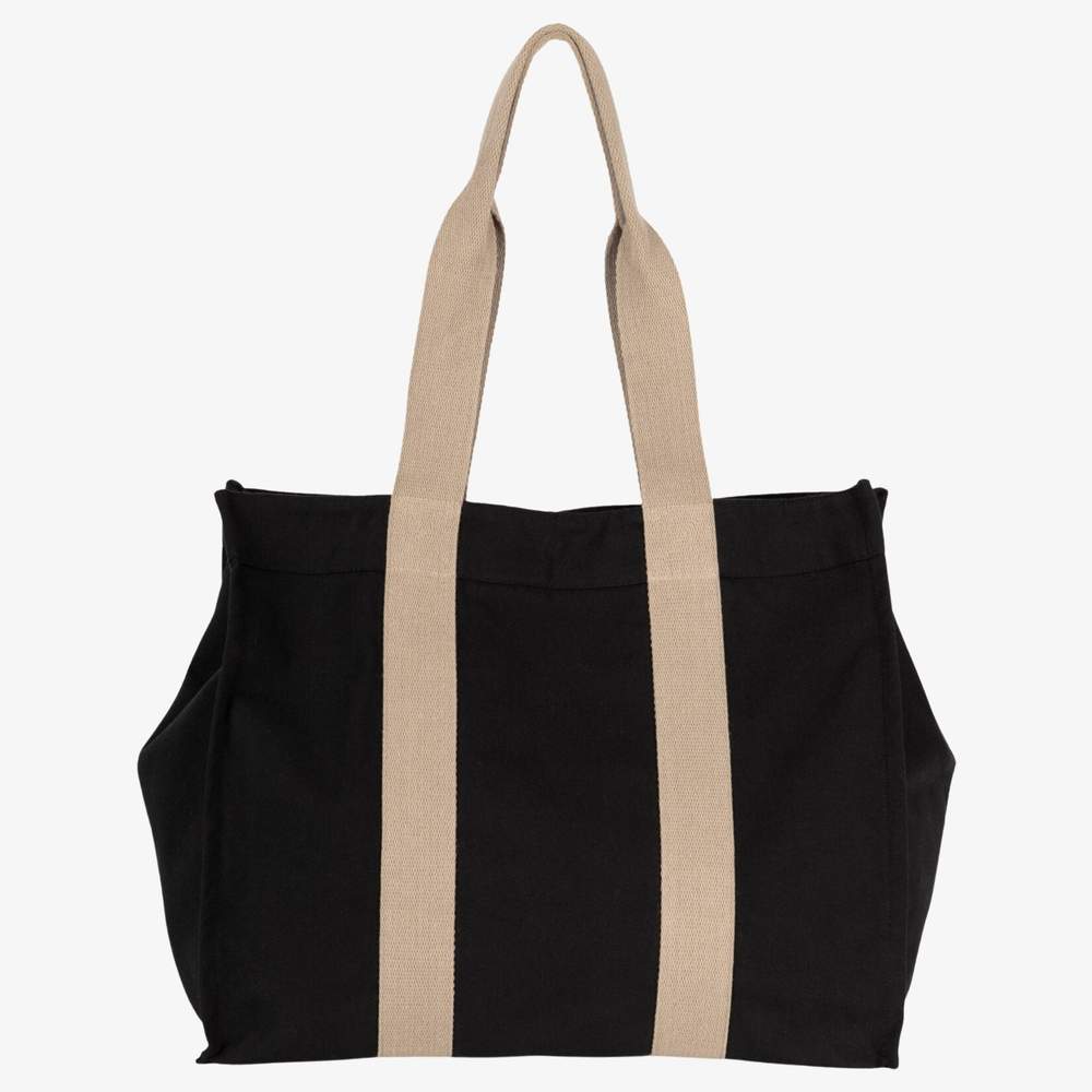 Stor indkøbspose med fold, fremstillet af recyclet bomuld og recyclet polyester. Denne pose tilbyder en kapacitet på 36 liter, hvilket gør den egnet til forskellige daglige brug. Den er udstyret med en indre lomme med glidelås til sikker opbevaring af små genstande. Håndtagene, syet gennem hele posen, forstærker holdbarheden og transportkomforten.
