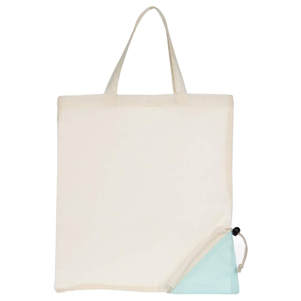 Foldbar indkøbspose i bomuld. Denne pose kan let foldes sammen i sin egen lomme, lukkes med et snor. Den har en kapacitet på 1,5 liter og dimensioner på 38 cm x 42 cm, hvilket gør den praktisk til indkøb eller transport af lette genstande. Den foldbare konstruktion tillader kompakt opbevaring, når den ikke er i brug.