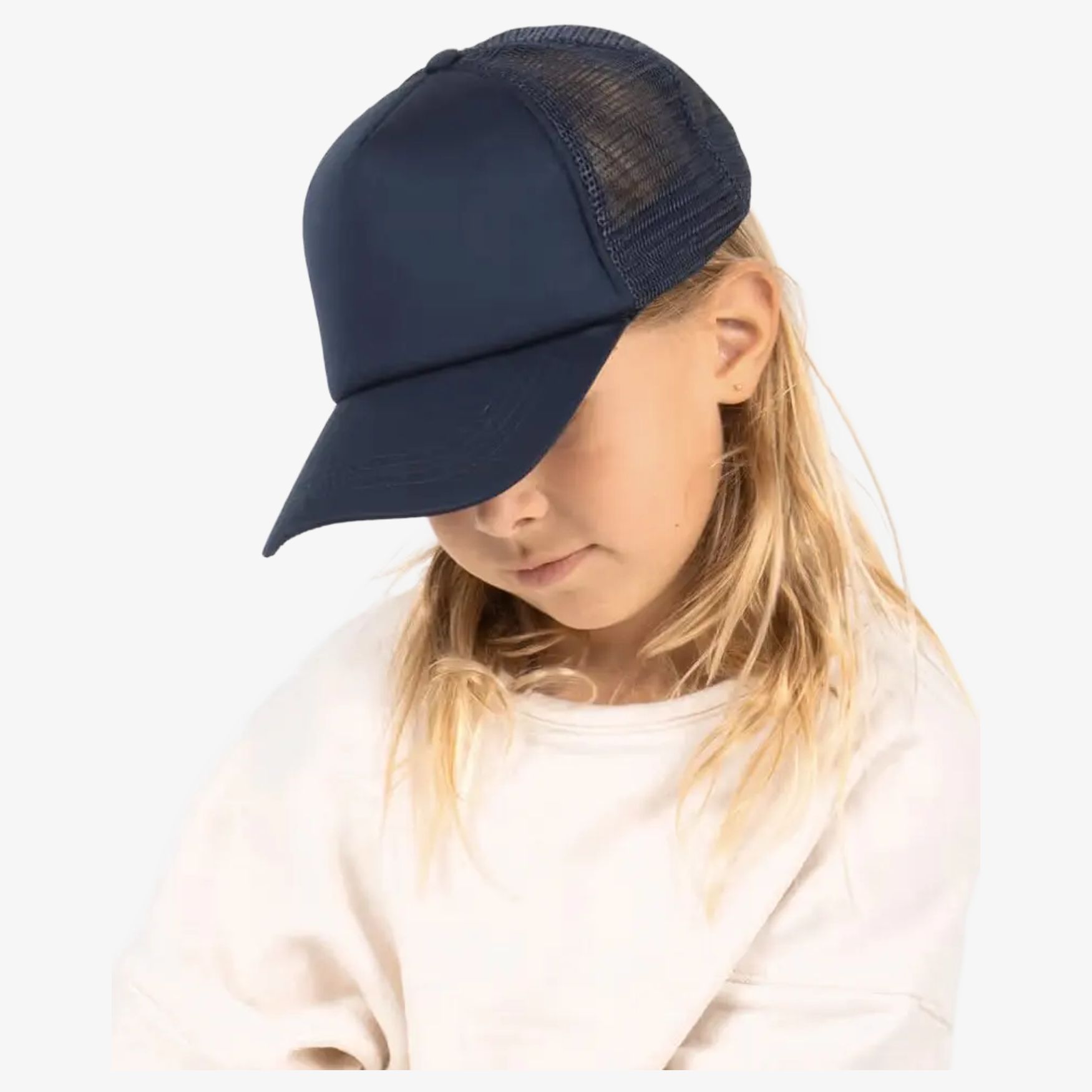 Børnekasket med 5 paneler, fremstillet af polyester for optimal komfort. Den har et net bagpå til bedre ventilation. En plastikjusteringssnore gør det muligt at justere kasketten for perfekt pasform. Hovedomkredsen er på 53 cm. Etiketten kan fjernes.