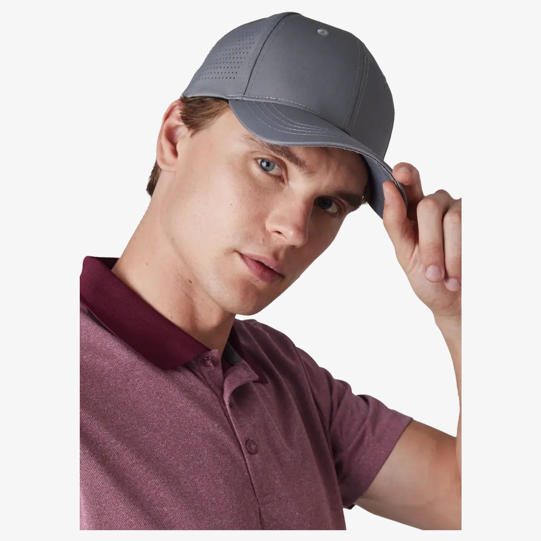 Mikroperforeret 6-panel kasket er en kasket med 4 bagpaneler, der er laser-mikroperforerede for at fremme ventilation. Buet skygge og velcrolukning for enkel justering.