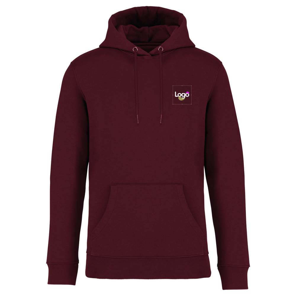 Unisex sweatjacke med hætte lavet af tre-tråd gratfleece (Low Shrinkage Fleece : prætrukket fleece). Passer tæt med kanguro lomme, ribbet bund på jakken og ærmene. Dobbelt sømning på ærmene, armhuler, bund af jakken og halv måne. Indvendig renhedsstripe i nakkebag og hætte dobbelttet med hovedmaterialet og stopperpunkt. Rundt snor med ender og øjne af recyclet metal. Sammensætning: 85% peget ring-spun biologisk bomuld og 15% post-consumer genbrugspolyester. Mulighed for personliggørelse ved brodering eller din logo.