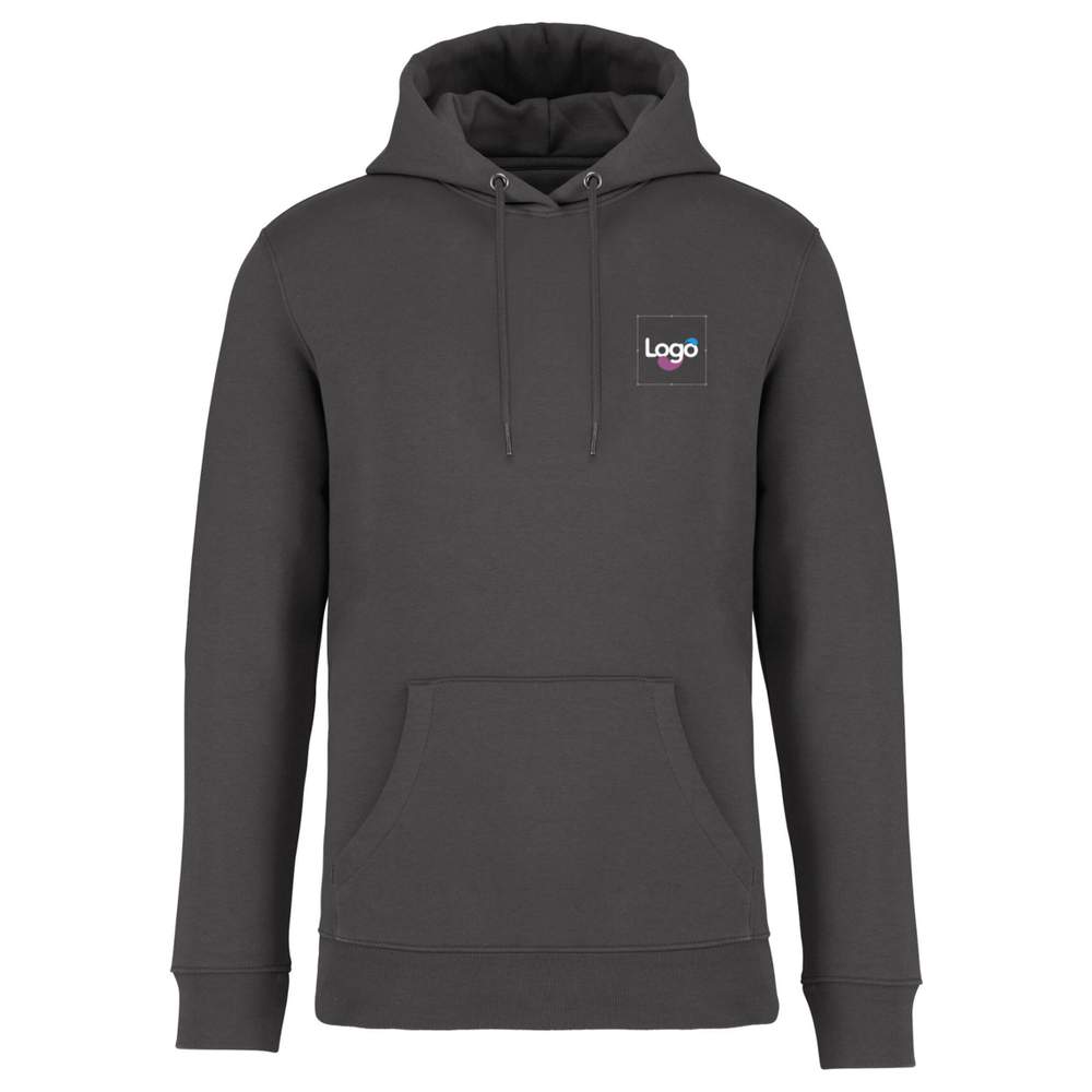 Unisex sweatjacke med hætte lavet af tre-tråd gratfleece (Low Shrinkage Fleece : prætrukket fleece). Passer tæt med kanguro lomme, ribbet bund på jakken og ærmene. Dobbelt sømning på ærmene, armhuler, bund af jakken og halv måne. Indvendig renhedsstripe i nakkebag og hætte dobbelttet med hovedmaterialet og stopperpunkt. Rundt snor med ender og øjne af recyclet metal. Sammensætning: 85% peget ring-spun biologisk bomuld og 15% post-consumer genbrugspolyester. Mulighed for personliggørelse ved brodering eller din logo.