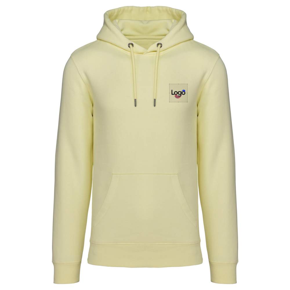 Unisex sweatjacke med hætte lavet af tre-tråd gratfleece (Low Shrinkage Fleece : prætrukket fleece). Passer tæt med kanguro lomme, ribbet bund på jakken og ærmene. Dobbelt sømning på ærmene, armhuler, bund af jakken og halv måne. Indvendig renhedsstripe i nakkebag og hætte dobbelttet med hovedmaterialet og stopperpunkt. Rundt snor med ender og øjne af recyclet metal. Sammensætning: 85% peget ring-spun biologisk bomuld og 15% post-consumer genbrugspolyester. Mulighed for personliggørelse ved brodering eller din logo.