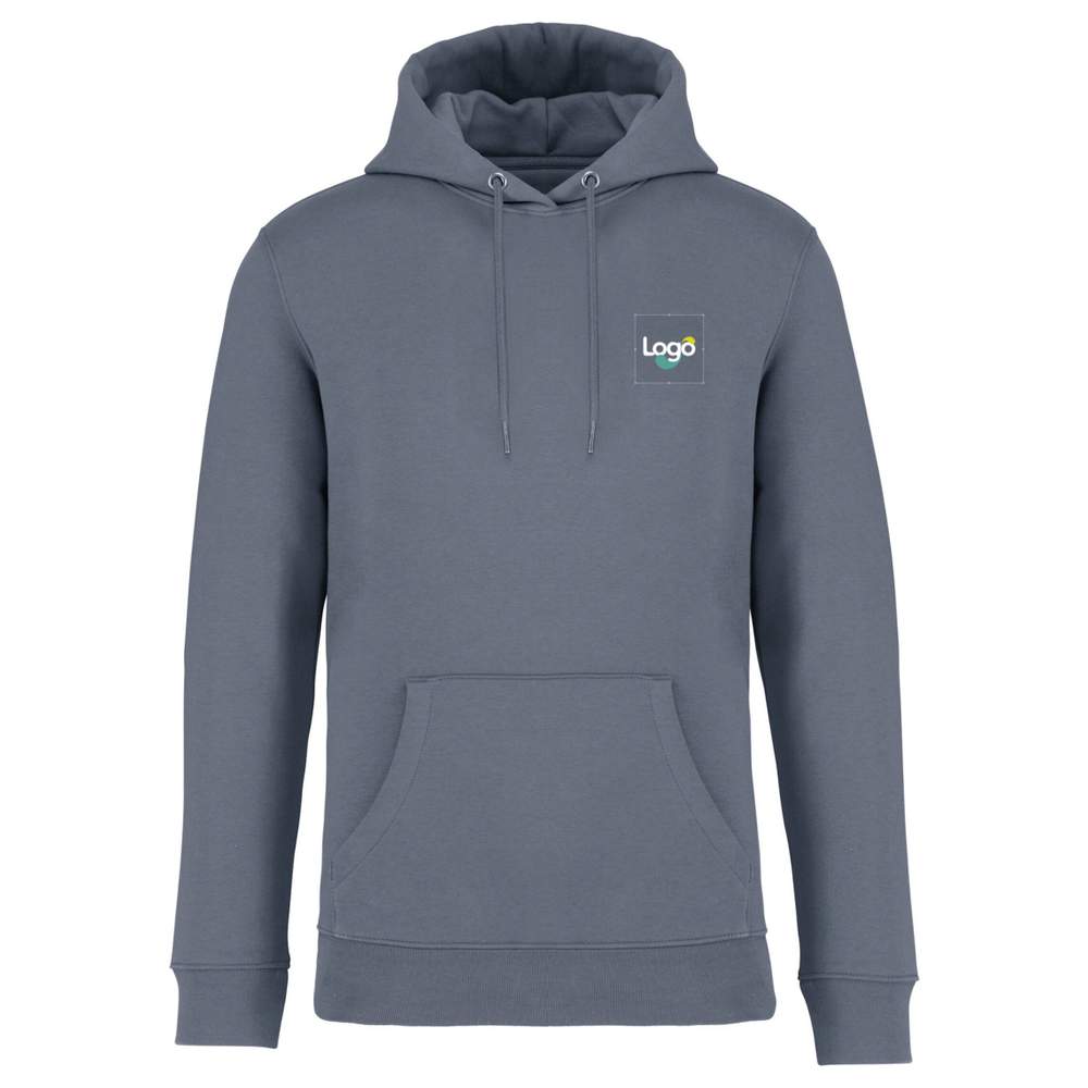 Unisex sweatjacke med hætte lavet af tre-tråd gratfleece (Low Shrinkage Fleece : prætrukket fleece). Passer tæt med kanguro lomme, ribbet bund på jakken og ærmene. Dobbelt sømning på ærmene, armhuler, bund af jakken og halv måne. Indvendig renhedsstripe i nakkebag og hætte dobbelttet med hovedmaterialet og stopperpunkt. Rundt snor med ender og øjne af recyclet metal. Sammensætning: 85% peget ring-spun biologisk bomuld og 15% post-consumer genbrugspolyester. Mulighed for personliggørelse ved brodering eller din logo.