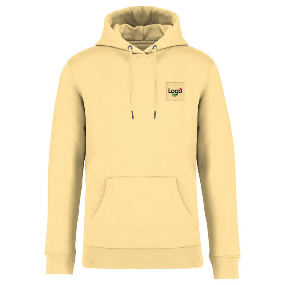 Unisex sweatjacke med hætte lavet af tre-tråd gratfleece (Low Shrinkage Fleece : prætrukket fleece). Passer tæt med kanguro lomme, ribbet bund på jakken og ærmene. Dobbelt sømning på ærmene, armhuler, bund af jakken og halv måne. Indvendig renhedsstripe i nakkebag og hætte dobbelttet med hovedmaterialet og stopperpunkt. Rundt snor med ender og øjne af recyclet metal. Sammensætning: 85% peget ring-spun biologisk bomuld og 15% post-consumer genbrugspolyester. Mulighed for personliggørelse ved brodering eller din logo.