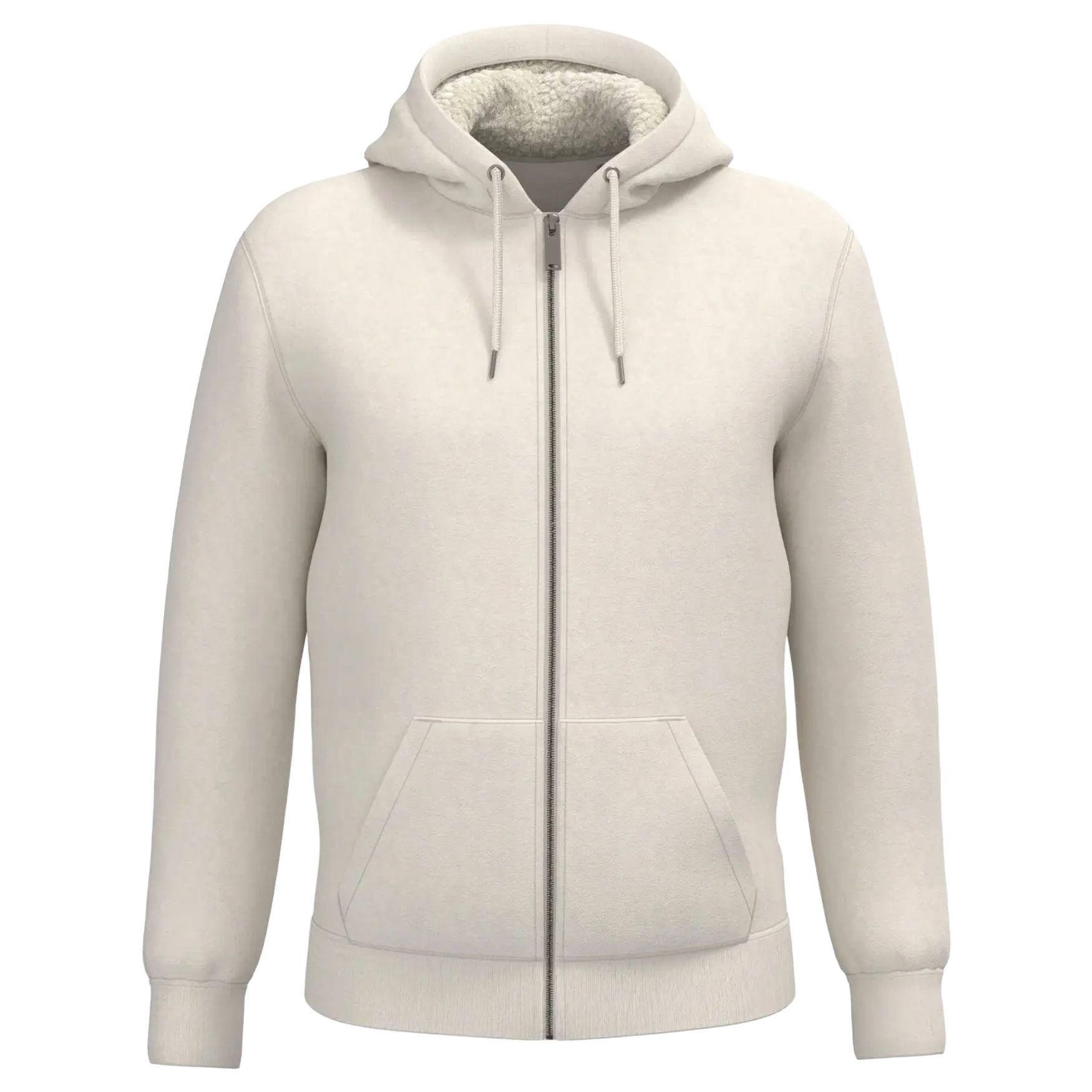 Sweat-shirt zippé doublé sherpa unisexe kombinerer økologisk bomuld og genanvendt polyester med sherpa-for i lys natur på hætte, ærmer og krop. Den har en lige pasform, forvasket fleece og en lynlås foran i genanvendt metal. Ribkant 1x1 på ærmer, nederst og ved kraven. Hætten er todelt og foret med sherpa, med rund snor og ender i genanvendt metal. Kængurulommen fuldender designet. Kan tilpasses efter projekt.