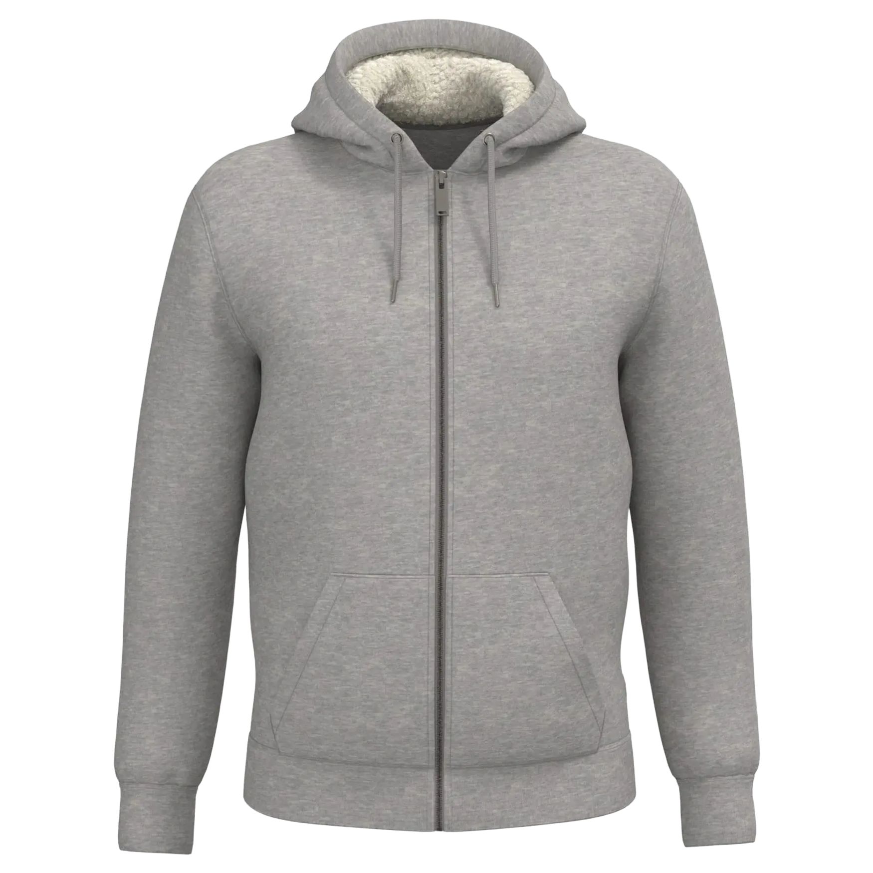 Sweat-shirt zippé doublé sherpa unisexe kombinerer økologisk bomuld og genanvendt polyester med sherpa-for i lys natur på hætte, ærmer og krop. Den har en lige pasform, forvasket fleece og en lynlås foran i genanvendt metal. Ribkant 1x1 på ærmer, nederst og ved kraven. Hætten er todelt og foret med sherpa, med rund snor og ender i genanvendt metal. Kængurulommen fuldender designet. Kan tilpasses efter projekt.
