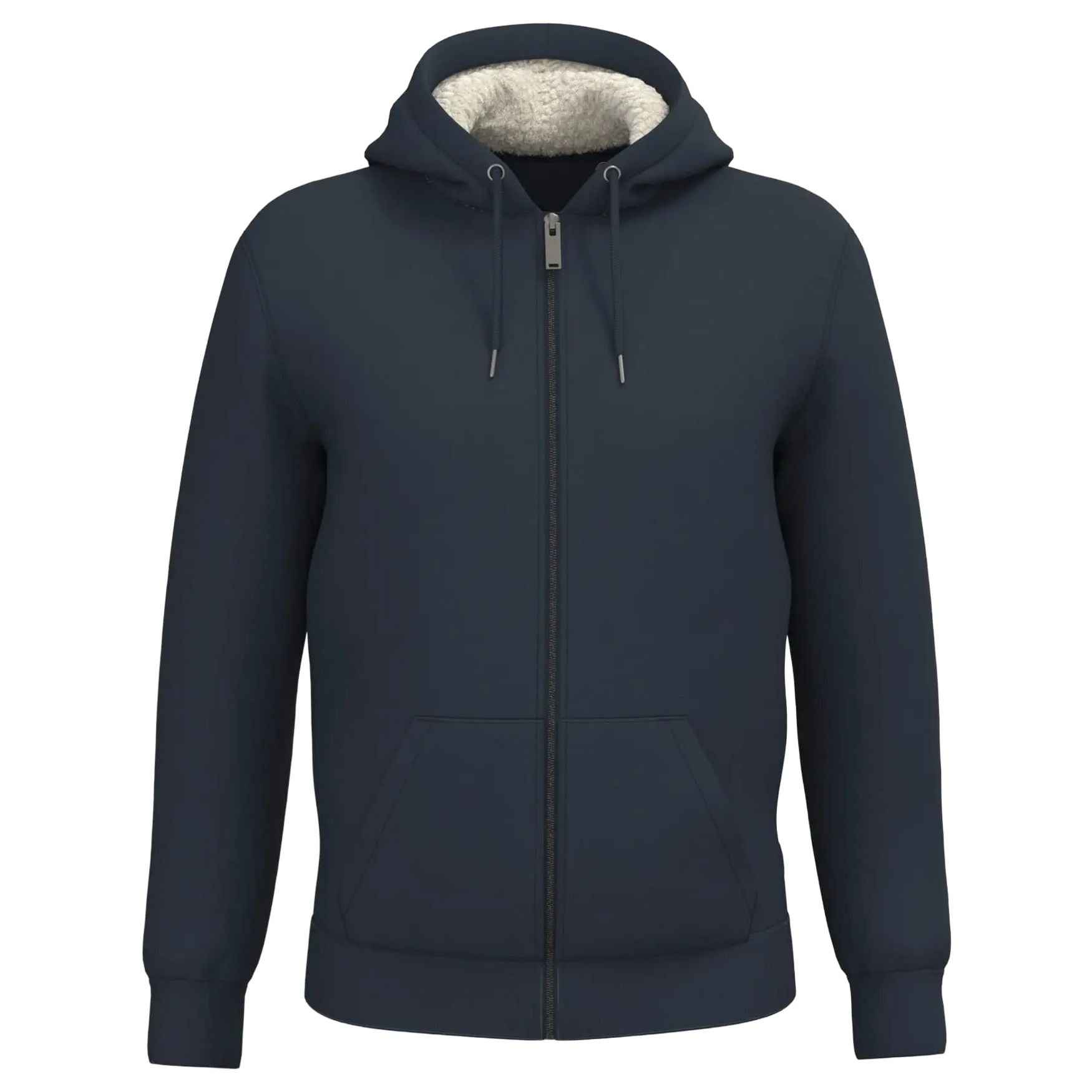 Sweat-shirt zippé doublé sherpa unisexe kombinerer økologisk bomuld og genanvendt polyester med sherpa-for i lys natur på hætte, ærmer og krop. Den har en lige pasform, forvasket fleece og en lynlås foran i genanvendt metal. Ribkant 1x1 på ærmer, nederst og ved kraven. Hætten er todelt og foret med sherpa, med rund snor og ender i genanvendt metal. Kængurulommen fuldender designet. Kan tilpasses efter projekt.