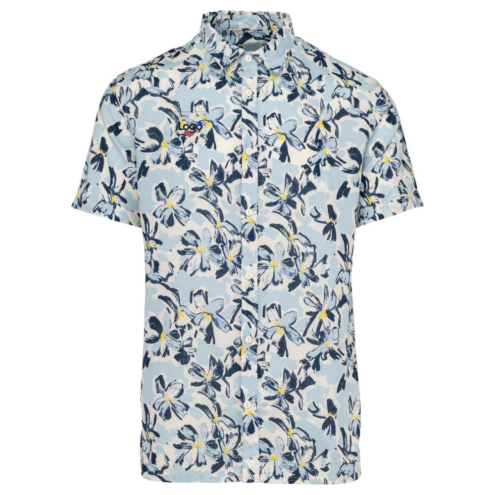 T-shirt med kystmønster til mænd. Vævet. Ajusteret pasform. Side sømme. Skjortekræve med krævefod. Tilføjet knaprække med kontrastknapper. Bagdel med fordoblet forstærkning. Kontinuerligt trykt mønster. Skulder og underside af ærmene med dobbeltsting. Dobbeltsting i bund af ærmene og tøjet. Tøjet vaskes efter montering: farverne kan variere fra produkt til produkt. Mulighed for personificering i broderi.