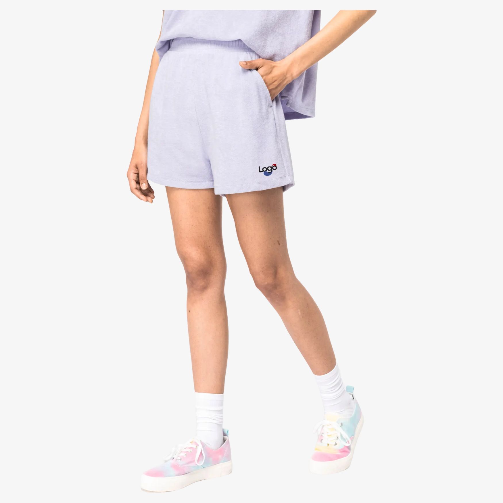 Kvindeshort i Towel Terry-materiale, lavet af frottéstof bestående af 80% økologisk bomuld og 20% genanvendt polyester efter forbrugerbrug. Beklædningen er vasket efter samling og kan have farvevariationer. Udstyret med elastisk talje og to sidelommer.