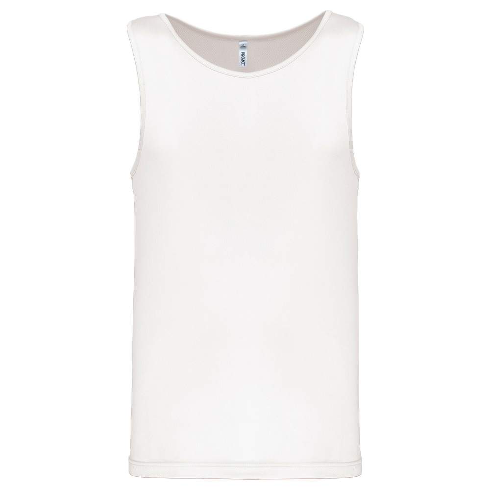 Denne sport BH for mænd er lavet af 100% polyester, der giver et let stof og hurtig tørring for optimal komfort under dine træningsøvelser. Den har skråkanter ved halsen og armeåbningerne til større frihed i bevægelse. Dubbelstinget bundsøm sikrer øget holdbarhed.