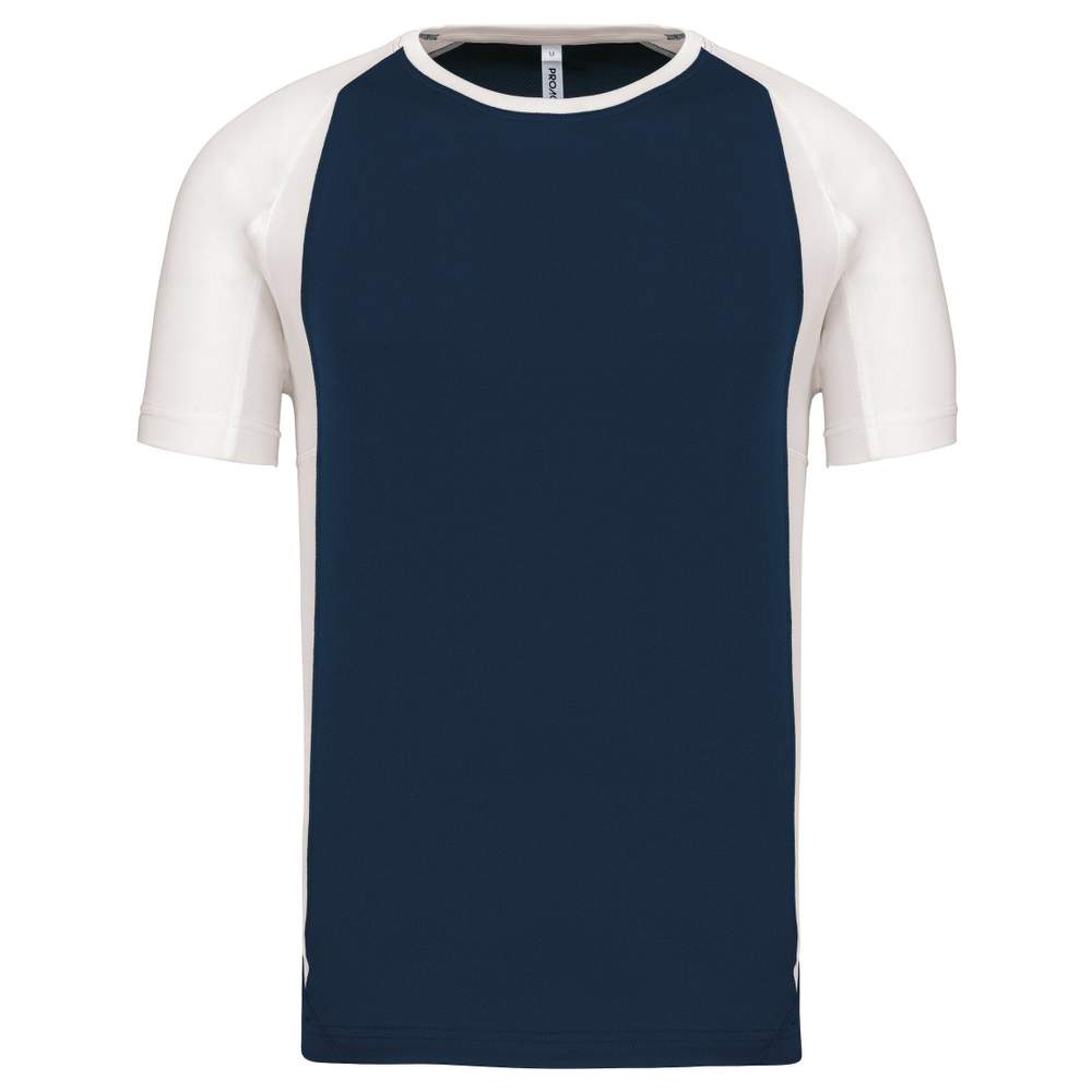 Dette tofarvede teejern er lavet af polyester til en behagelig sportspræstation. Det tilbyder god åndbarhed og hurtig tørring, hvilket letter fugtstyringen under træningen. Dens uniseksedesign gør det tilpasset til forskellige typer af kroppestrukturer. Raglanærmer og overlap på skulderafskæringer sikrer øget komfort og større frihed i bevægelse. Den dobbelte stingsforstærkning på bund, ærmer og krave øger dets holdbarhed.