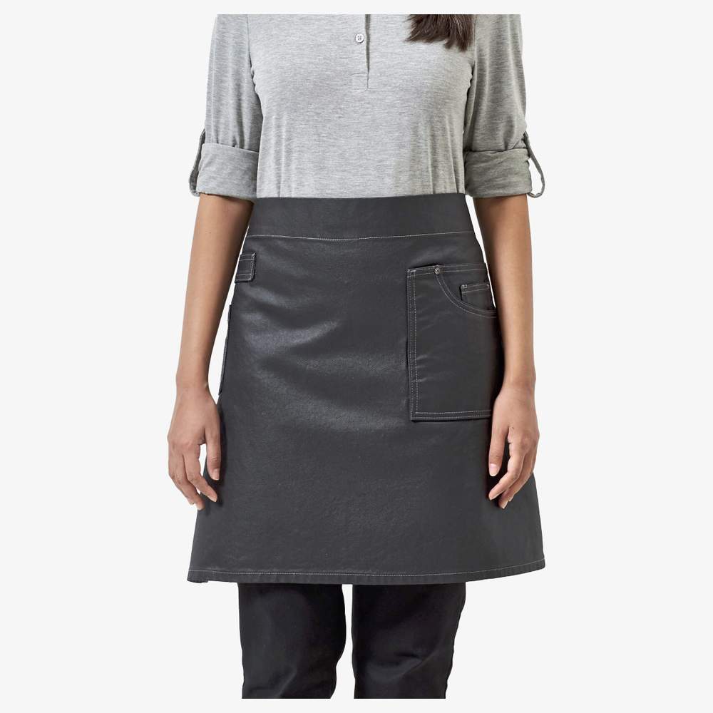 Dette midtlange lør følger stilen på en klassisk jean. Det har en påsat lomme med søm og knap, der er stor nok til at rumme en tablet. De klassiske søm understreger dets elegance. Den voksede overflade giver det et robust og holdbart udseende, der minder om en "chic industriel" stil. Kontrasterende bånd er fastgjort med metaløje. Dimensioner: længde 50 cm, bredde 70 cm. Sammensætning: 100% bomuld. Dette lør kan personaliseres ved broderi for at vise dit logo eller dit visuelle element.