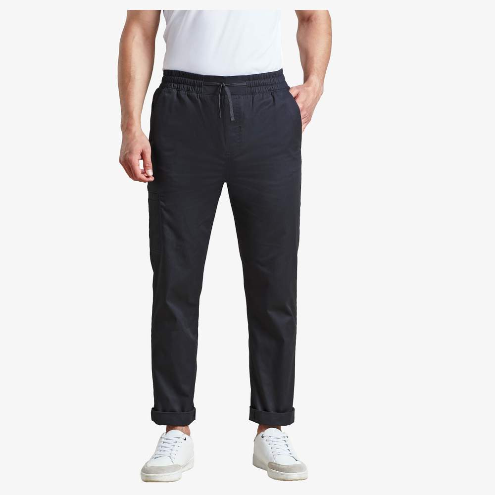 Kokkekravebukser fremstillet af genanvendte materialer. Smalende ben med omvendt krage til en afslappet stil. Elastisk talje, snørelås og falsk flydeknap. Flere lommer (to foran på siderne og en bag med trykknap). Let væv.