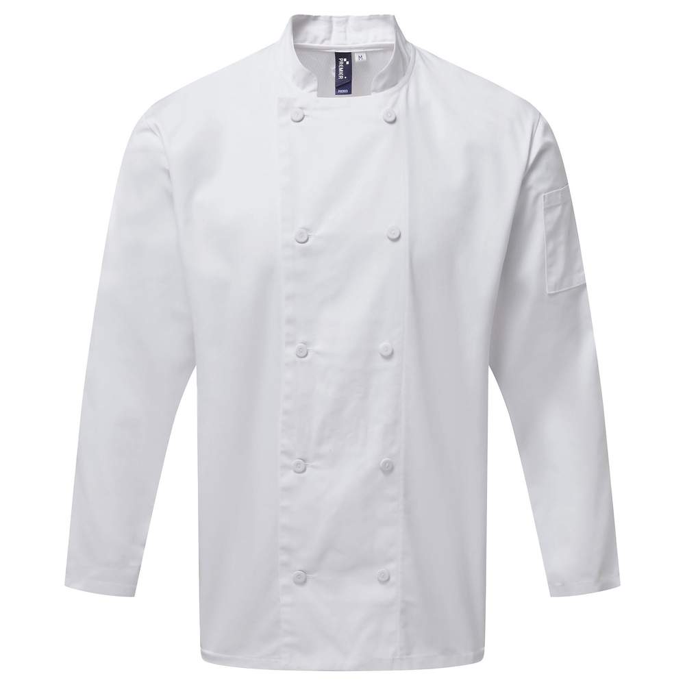 Køkkendrak med lange ærmer designet til at imødekomme kravene fra restaurationsprofessionelle. Lavet af Coolchecker®-stof, tilbyder den optimal komfort og god modstandsdygtighed mod slid. Denne drak er udstyret med en dobbelt lommepose til pen, hvilket gør det nemt at få adgang til vigtige værktøjer. Den mandarinkrage tilføjer en moderne og komfortabel touch. Låsning med trykknapper sikrer nem og sikker lukning. Sammensætningen på 65% polyester og 35% bomuld giver en god balance mellem komfort, holdbarhed og nem vedligeholdelse.