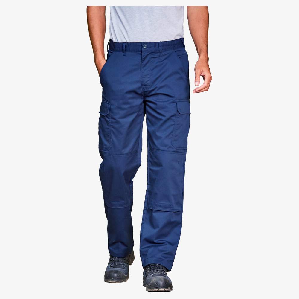 Arbejdstøj bukser konstrueret til at tilbyde komfort og holdbarhed i en professionel omgivelse. Den har en traditionel talje med skørter samt klassiske forlængede lommer foran. En skjult zipperlås sikrer en sikker og diskret pasform. To cargo lommer på hvert ben tilbyder praktisk opbevaringsplads til værktøj og tilbehør. En åben baglomme fuldender det hele. De polstrede knæbeskyttelseslommer, holdt på plads med en velcro lukning, forbedrer komforten og beskyttelsen under arbejde, der kræver at blive på knæ.