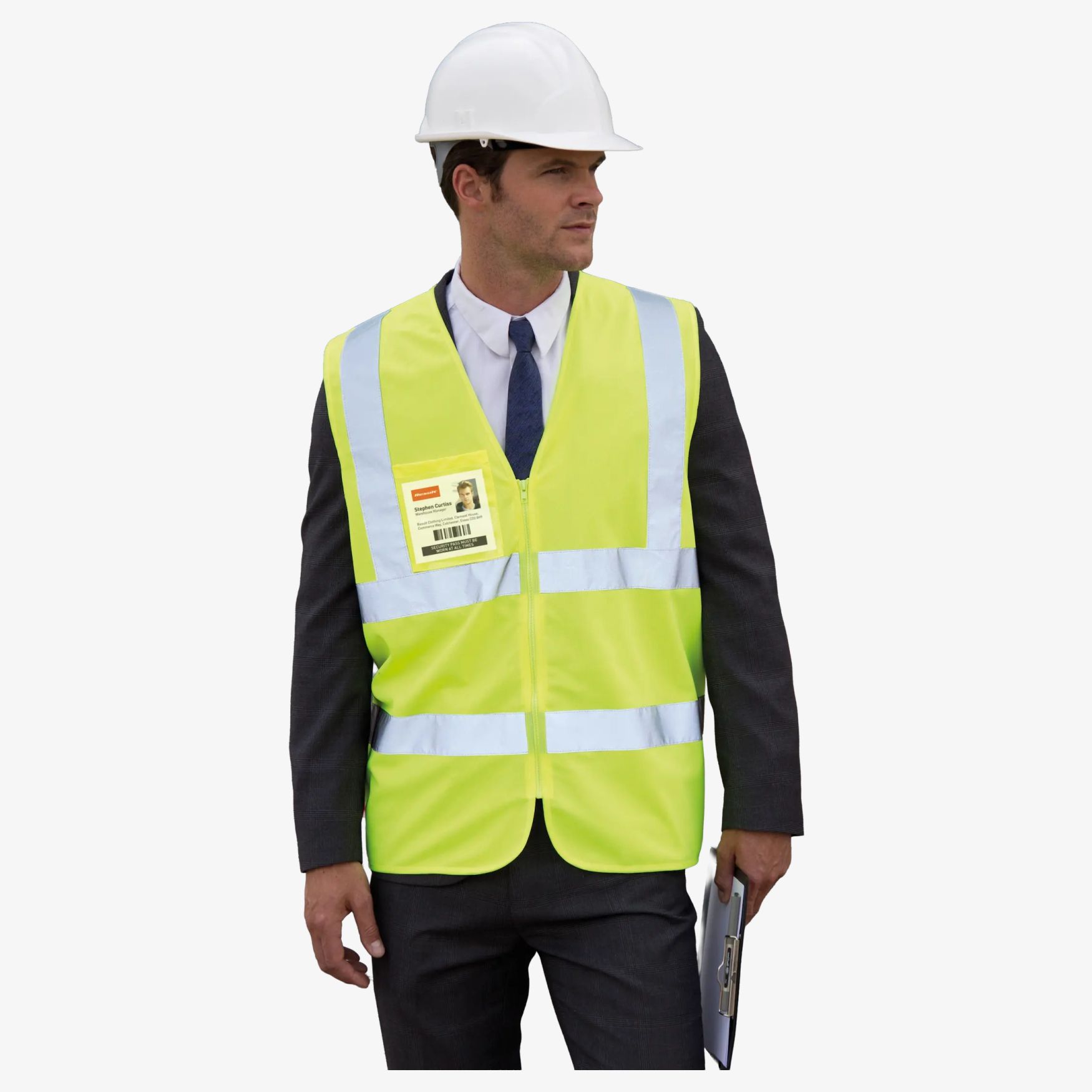 Zip i d Tabard er en sikkerhedsvest med lynlås og rummelig pasform, beregnet til at blive båret uden på tøj. En brystlomme til badge gør identifikation lettere, og påsyede refleksbånd forbedrer synligheden.