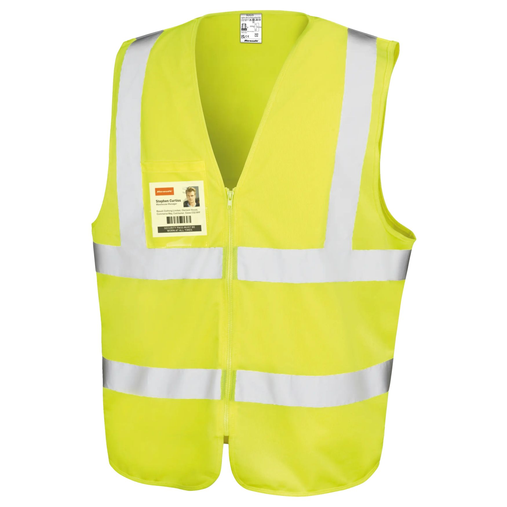 Zip i d Tabard er en sikkerhedsvest med lynlås, beregnet til at blive båret uden på tøjet. Brystlommen gør det muligt at indsætte et adgangsbadge i formatet 95 x 60 mm. Påsyede reflekser på 50 mm og kantbåndede kanter fuldender helheden. Mulighed for tilpasning.
