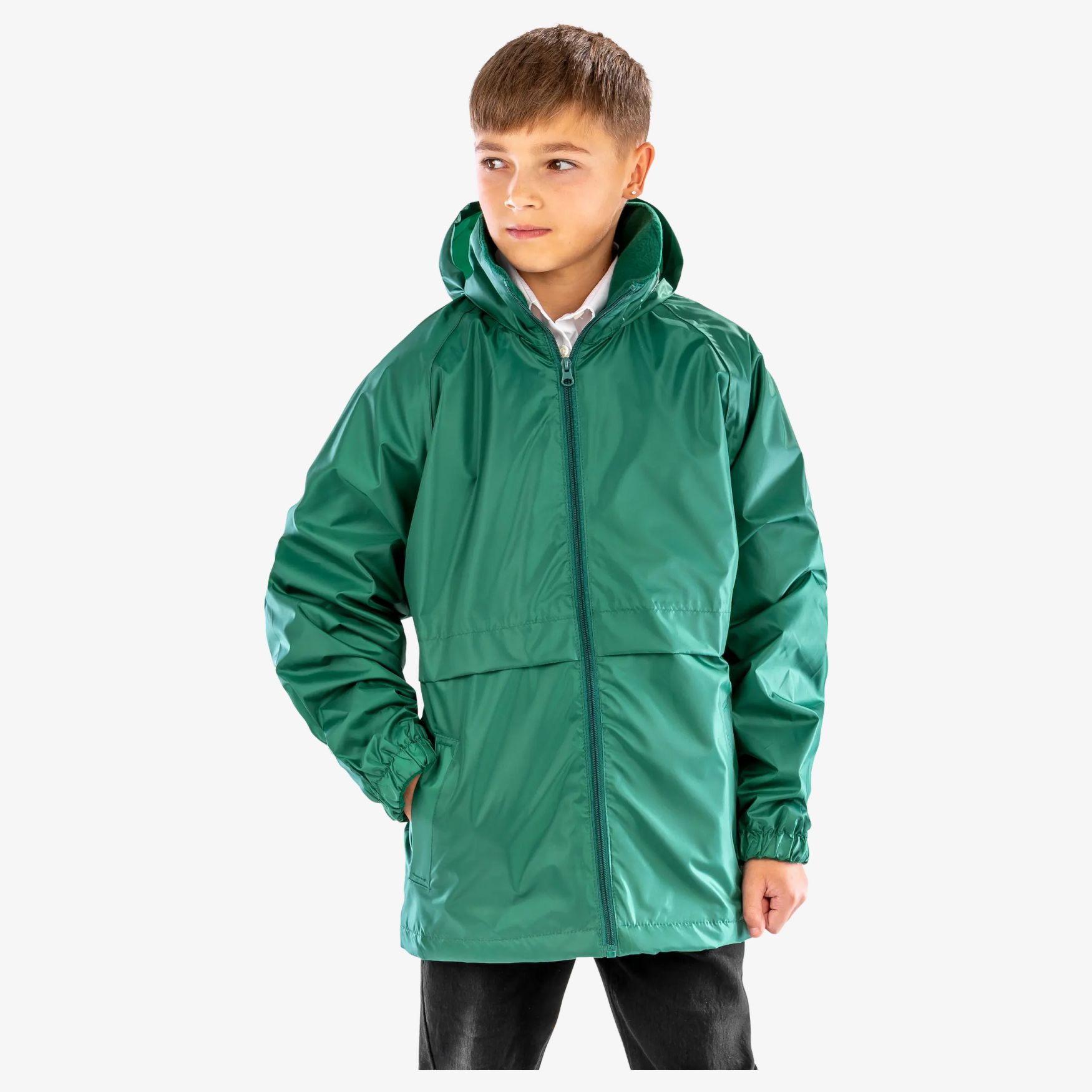Junior Microfleece-jakken er en let børnejakke, vindtæt og vandtæt 2000 mm, med fleecefor. Skjult hætte, sidelommer med læg, elastiske manchetter og varmesvejsede hovedsømme.