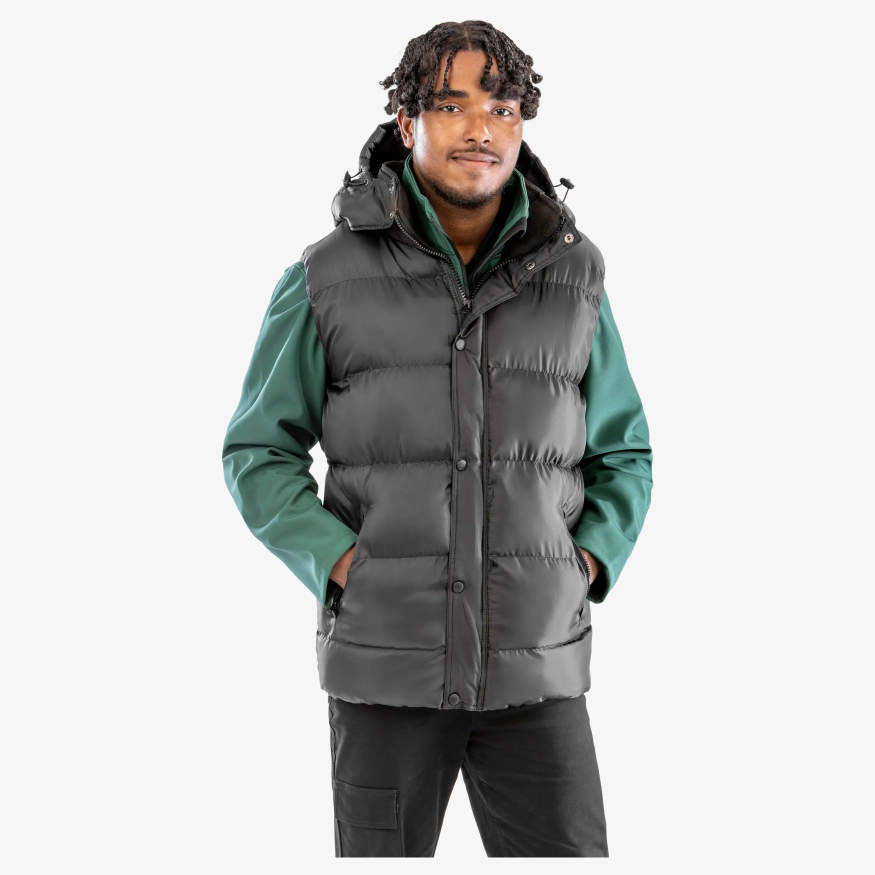 Nova lux vatteret bodywarmer-vest med meget tyk polstring, aftagelig justerbar hætte og anti-indtrængningsfinish. Brug i koldt vejr, med beskyttelse mod vand og vind. Sidelommer med lynlås og indvendig brystlomme med lynlås til opbevaring.