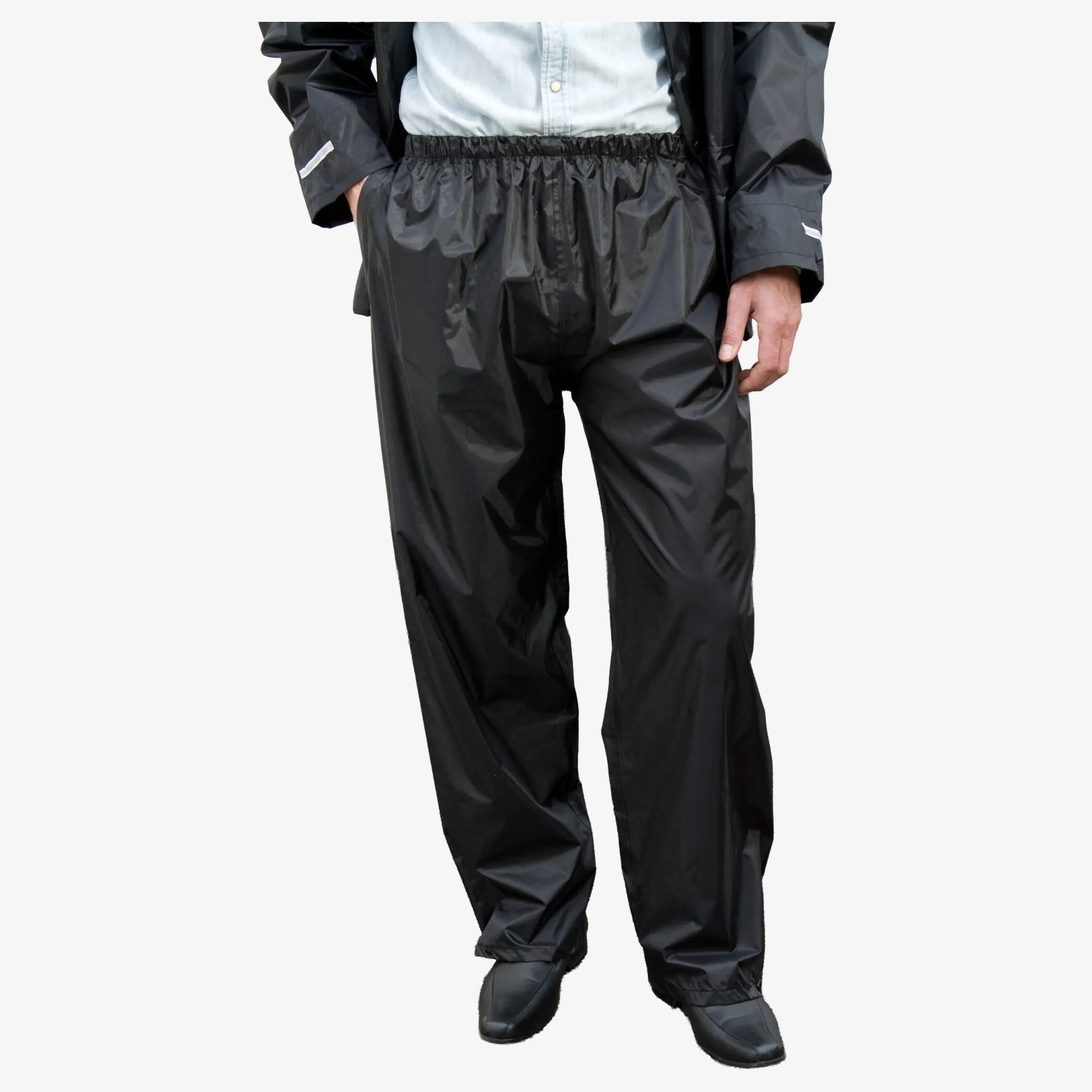 Waterproof rain Trouser er vandtætte regnbukser, der er designet til at begrænse fugt i regnvejr. De kombinerer en elastisk talje, ankler med trykknapper til justering og to sidelommer for adgang til tøjet, der bæres under.