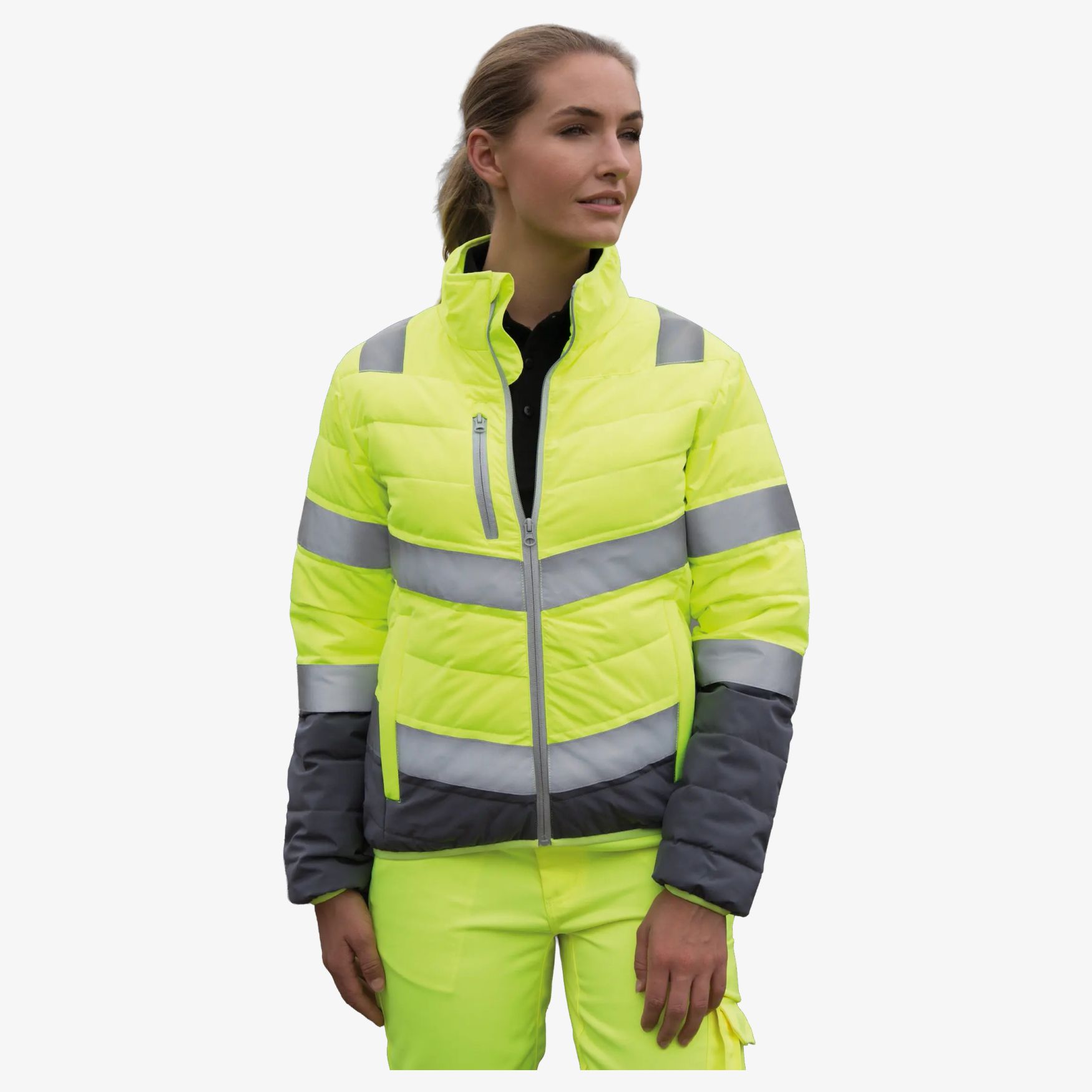 Sikkerhedsjakke til kvinder er en højsynlig dynejakke med reflekterende bånd, lynlåslukning og flere lynlåslommer. Den figursyede talje og den længere ryg forbedrer dækning og komfort ved brug.