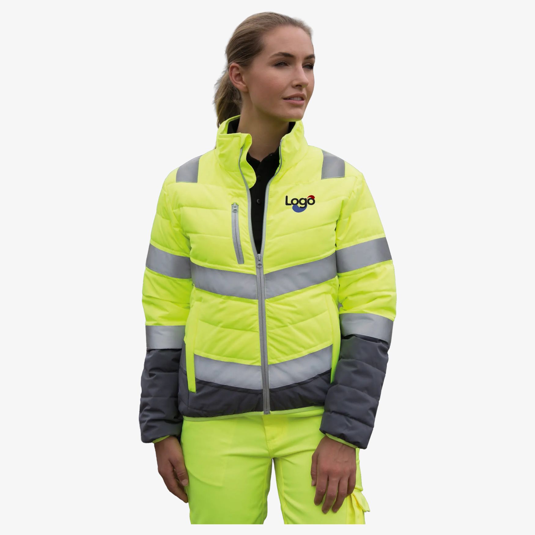 Sikkerhedsvesten til kvinder er en arbejdsquiltjakke med reflekterende bånd på kroppen, skuldrene og ærmerne. Lynlåslukning med hagebeskytter, lynlåslommer og indvendig lomme, med længere rygpanel og figursyet talje. Personalisering med tryk mulig.