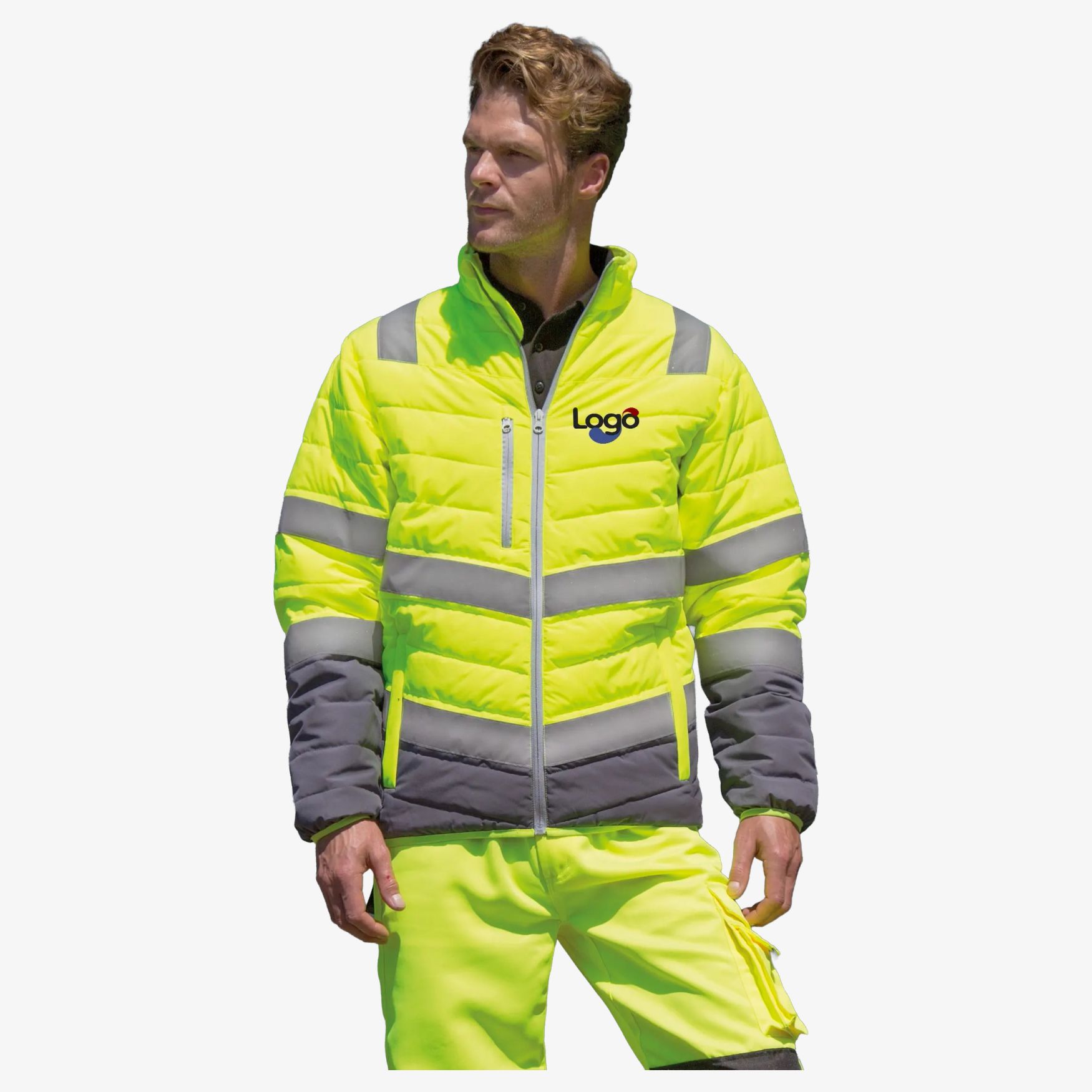 Den polstrede sikkerhedsvest er en hi-vis dunjakke med refleksbånd på kroppen, skuldrene og ærmerne. Polstring og for i polyester, bryst- og sidelommer med lynlås, indvendig lomme, længere ryg og hagebeskyttelse. Tilpasning mulig via mærkning.