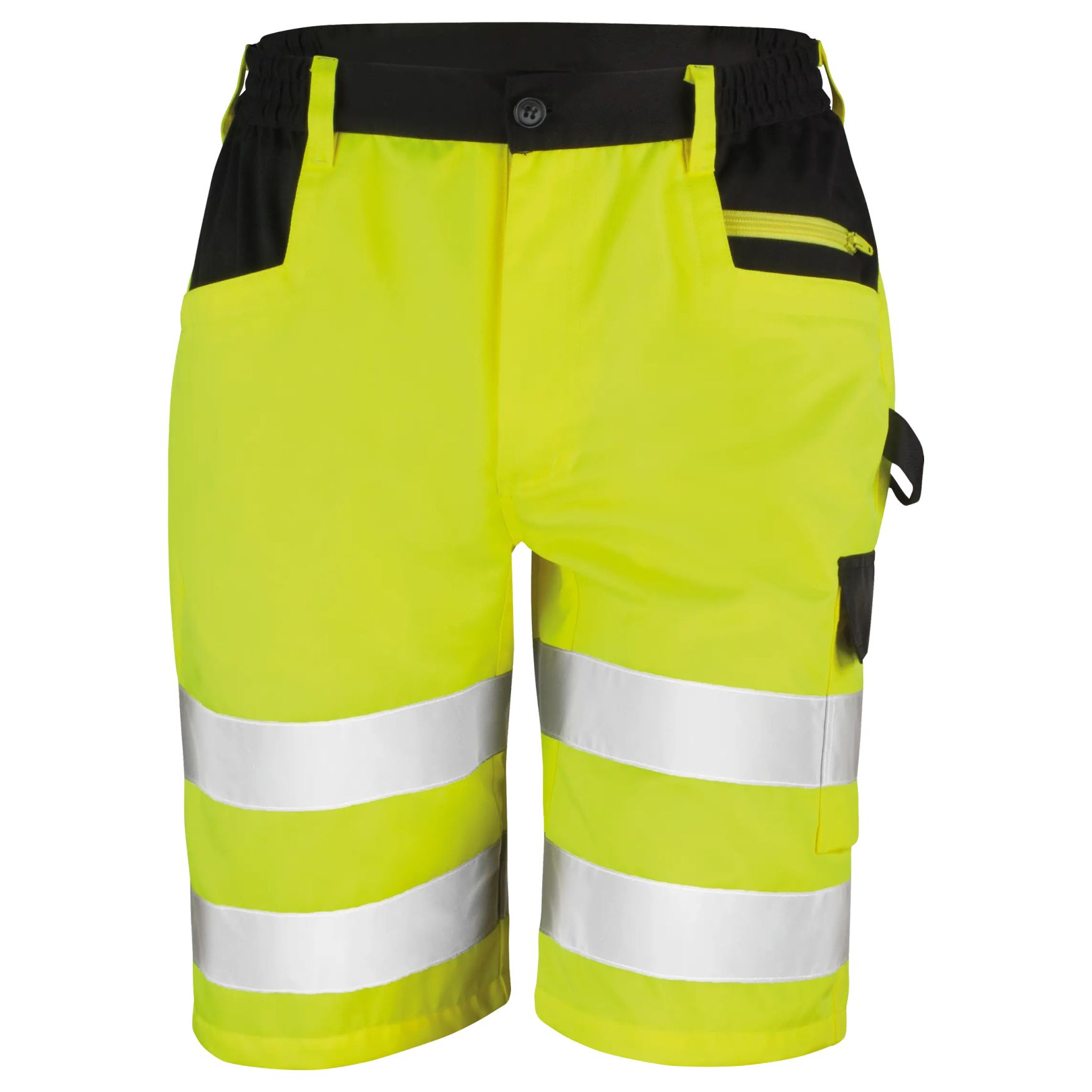 Safety Cargo Shorts er synlighedsshorts med løs pasform, designet til professionel brug. Delvist elastisk linning med bæltestropper, sidelommer og cargo-lomme, refleksbånd og lynlåsgylp.